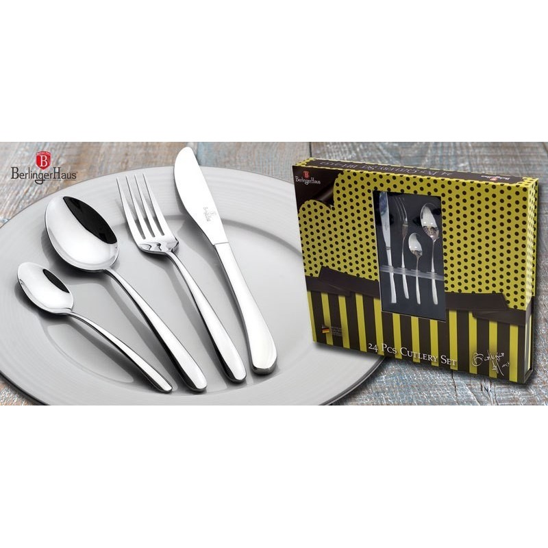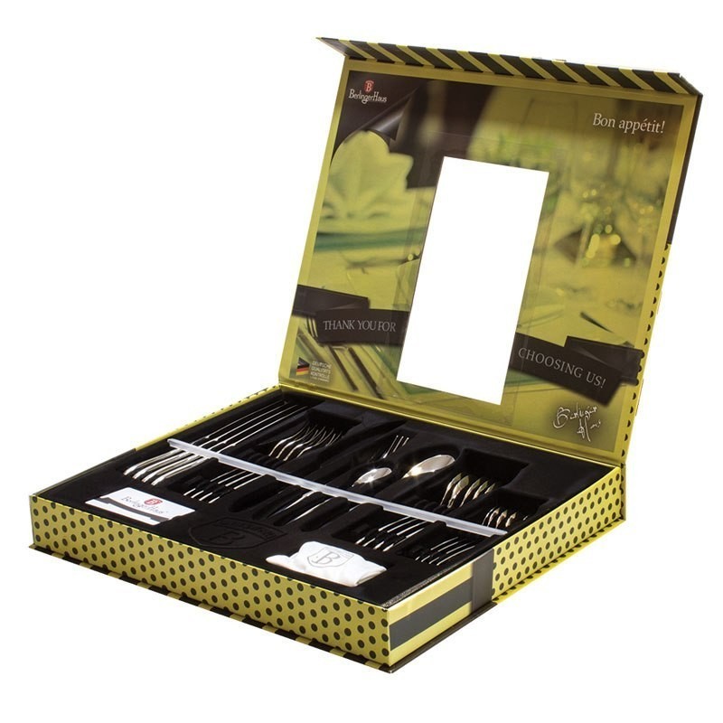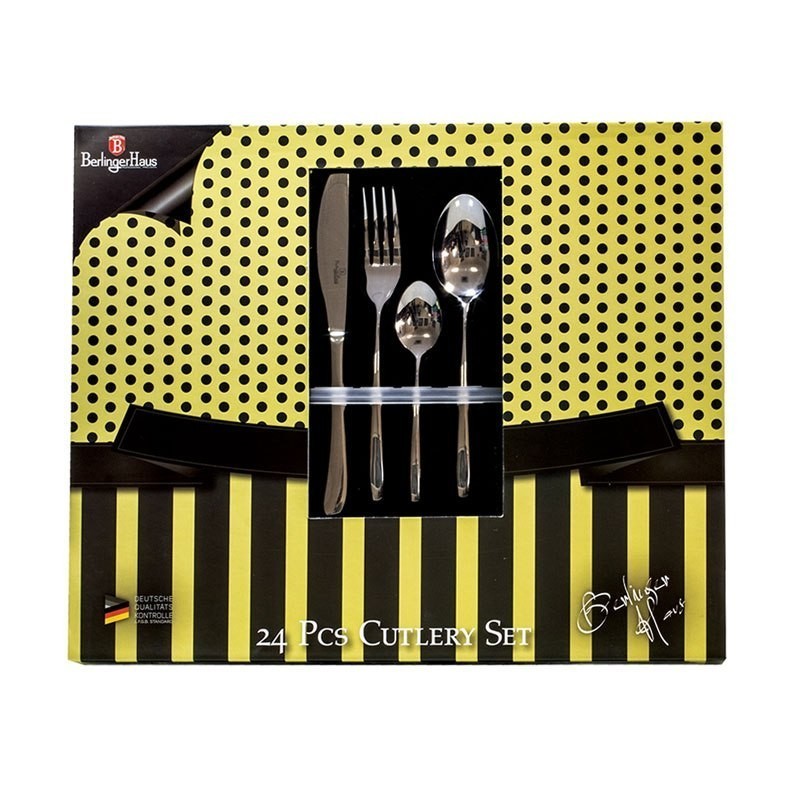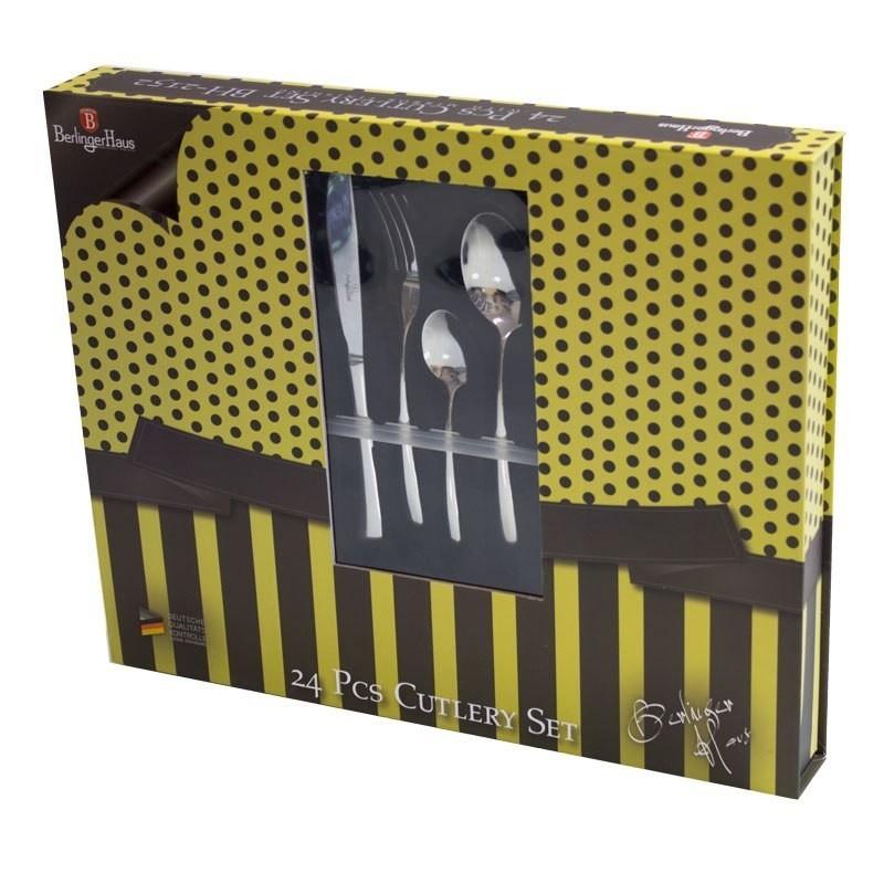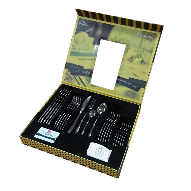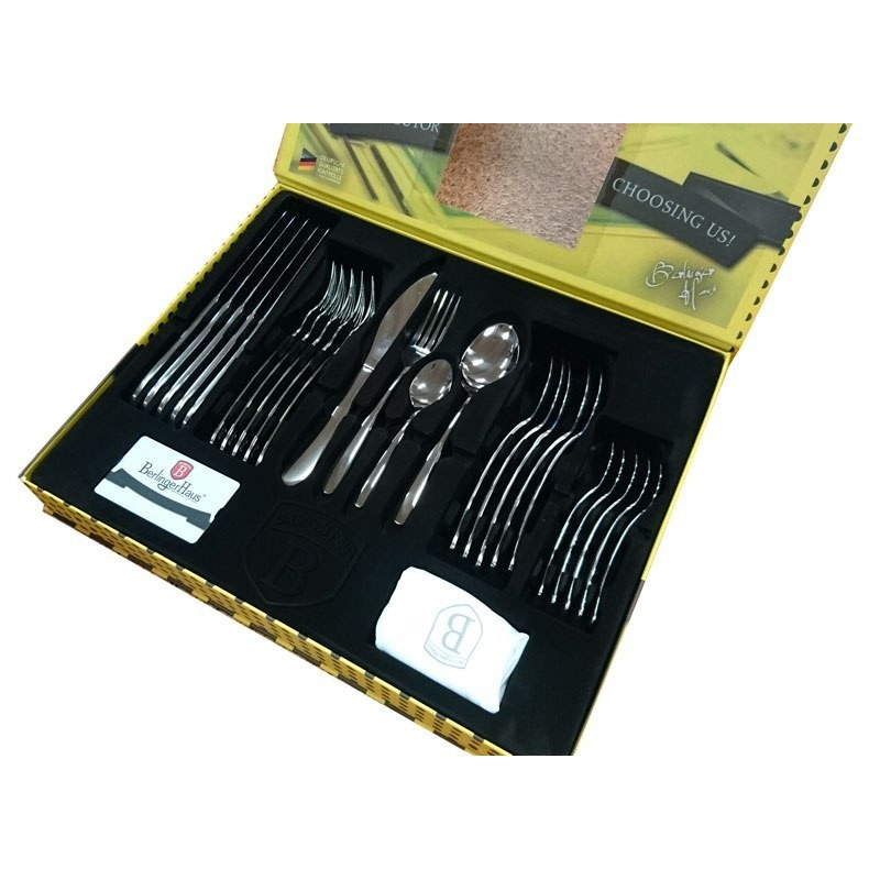 Komplet luksusowych sztućców na 6 osób 24 elementy BERLINGEN HAUS to praktyczny i elegancki pomysł na prezent. Doskonały pomysł na prezent na różne okazje. Pakowany w estetyczne pudełko z okienkiem. W środku sztućce umieszczone w delikatnej wytłoczce z logiem producenta oraz specjalną jedwabną rękawiczką.