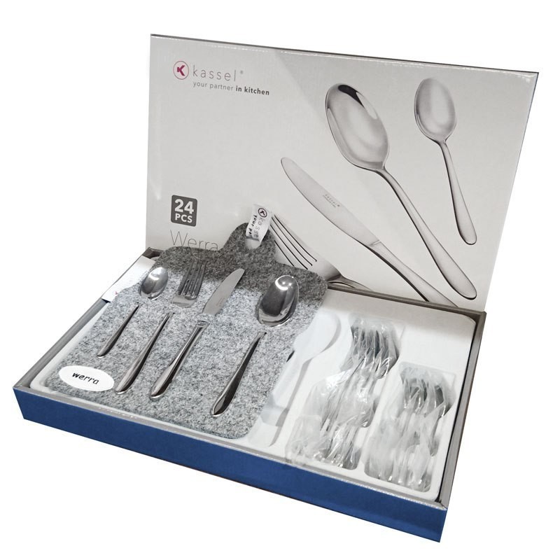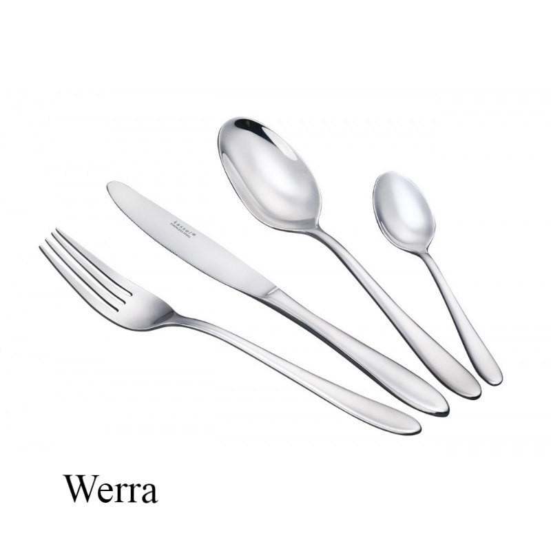 24 elementowy zestaw sztućców firmy KASSEL wzór WERRA wykonanych ze stali chirurgicznej Cr-Ni 18/10 polerowanej na wysoki połysk.