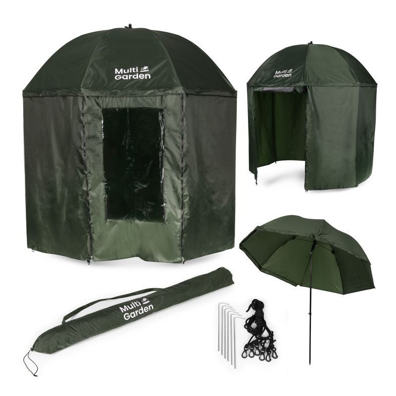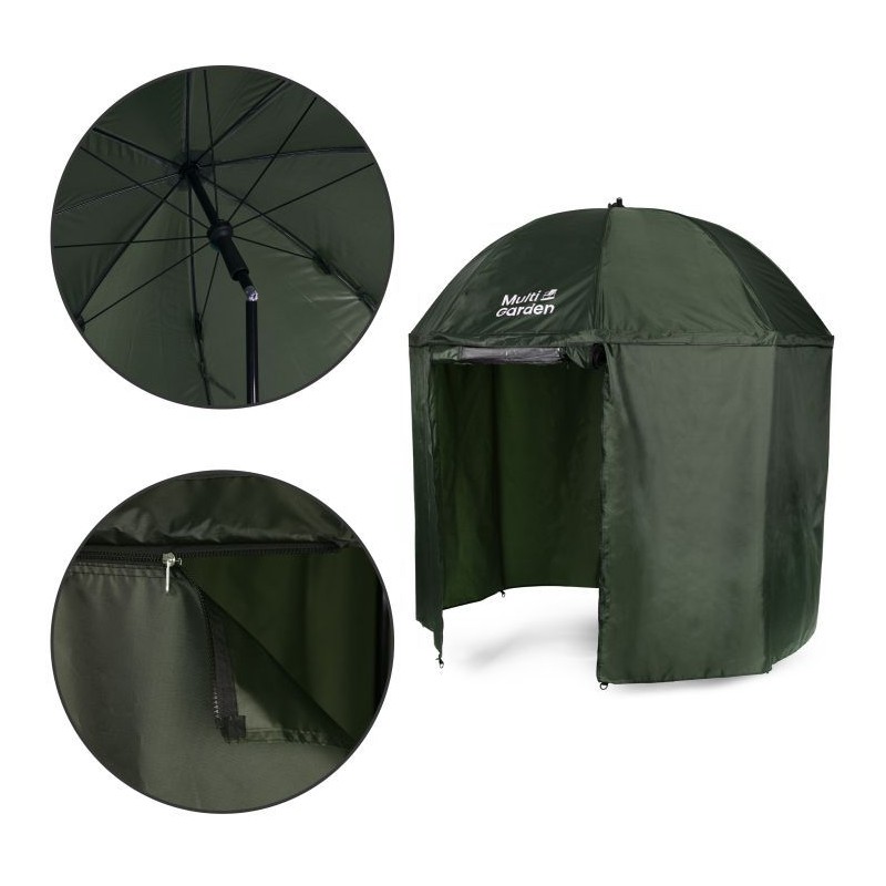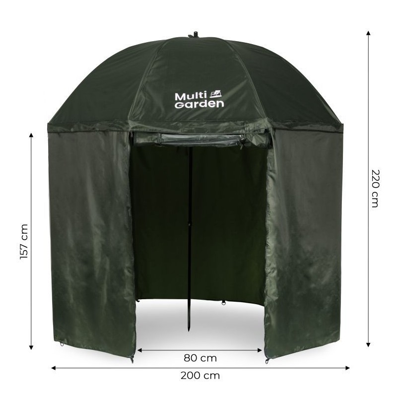 Parasol wędkarski z pełną osłoną został wykonany z wysokiej jakości wodoodpornego materiału, który skutecznie chroni przed opadami deszczu, promieniowaniem UV oraz silnym wiatrem. Dzięki temu, jest idealny dla wszystkich miłośników spędzania czasu na świeżym powietrzu. Parasol posiada także możliwość regulacji wysokości oraz nachylenia czaszy. W zestawie znajduje się torba transportowa ułatwiająca przenoszenie oraz sznurki i śledzie.