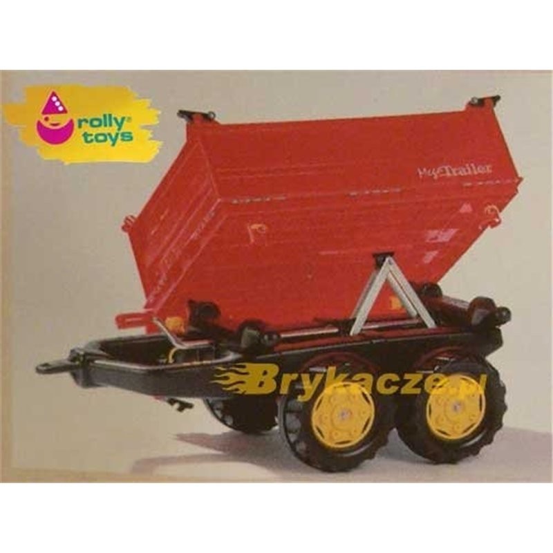 Przyczepa z wywrotką na 3 strony. Jest stabilna, ponieważ posiada 2 osie kół. Pasuje do każdego pojazdu Rolly Toys.