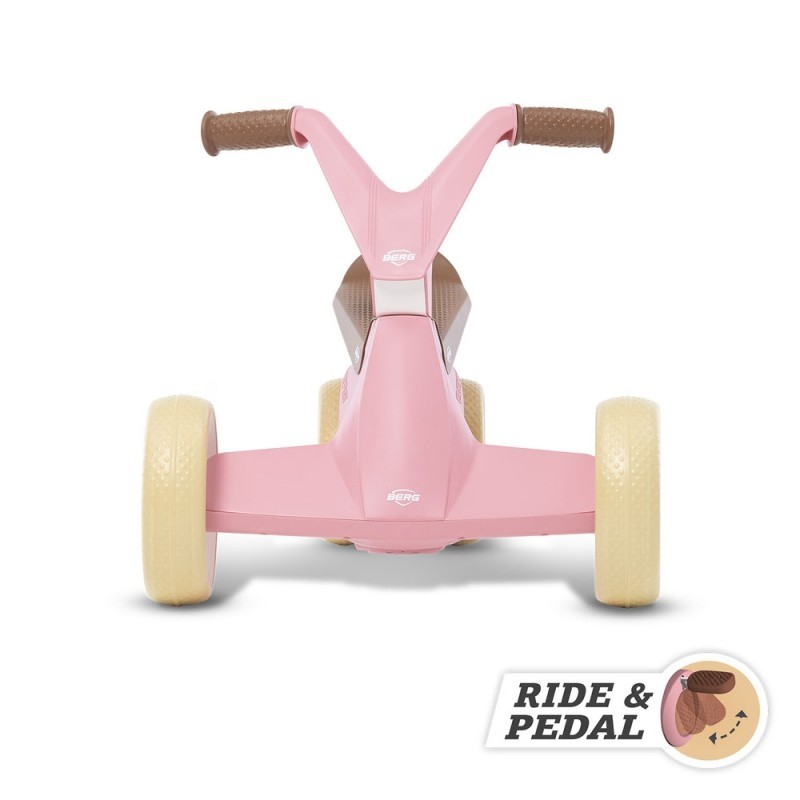 Różowy gokart na pedały marki BERG na licencji jest niezwykłym połączeniem gokarta i jeździka! Na początku może służyć jako jeździk, a młody kierowca odpychając się od ziemi nabierze pewności siebie i nauczy równowagi, a następnie po rozłożeniu pedałów może służyć jako rowerek. Siedzenie posiada antypoślizgową powierzchnię i jest wyprofilowane w taki sposób, by dziecko przyjmowało odpowiednią pozycję przez cały okres użytkowania, czyli do około 30 miesiąca życia. posiada łącznie cztery koła ze specjalnej pianki, przez co jest bardzo stabilny. Całość wykonana jest z bardzo mocnego tworzywa, a firma BERG zadbała o każdy, nawet najdrobniejszy szczegół.