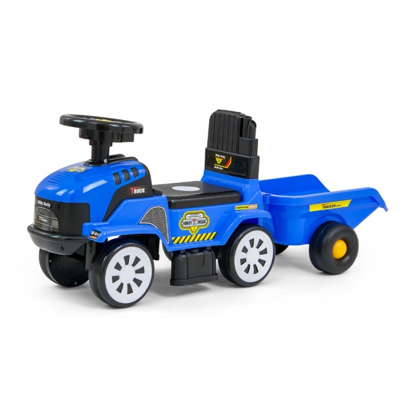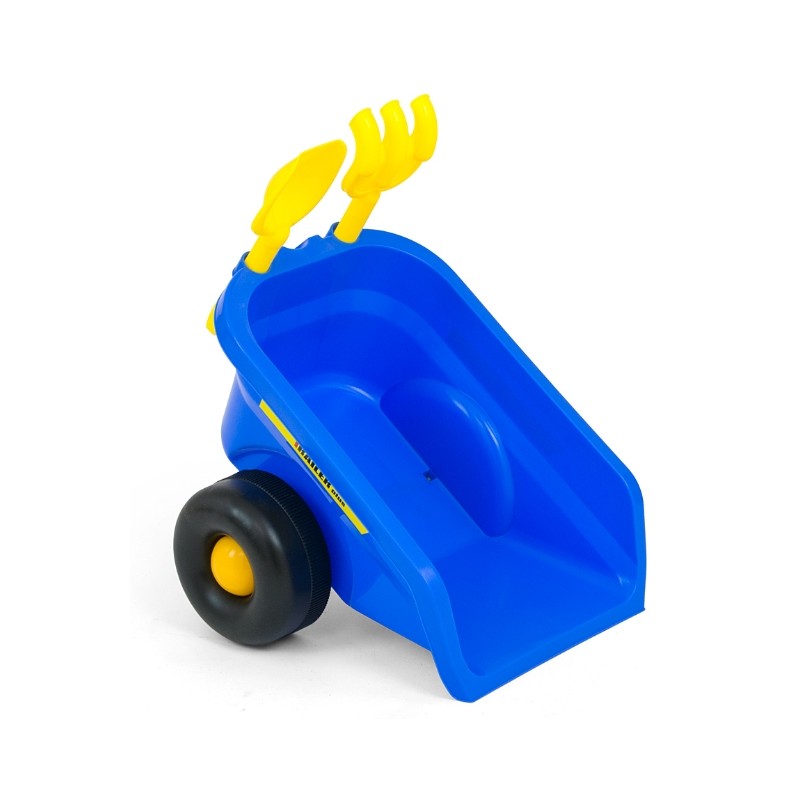 Odczepiana przyczepka z grabkami i łopatką pozwolą na transport zabawek lub piasku.