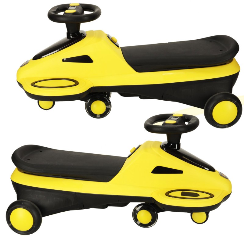 Żółto-czarny jeździk grawitacyjny to gwarancja niezapomnianej rozrywki! Podczas jazdy maluchy muszą ruszać obiema rękoma i balansować ciałem, co stanowi doskonały trening zdolności motorycznych. Aby zapewnić bezpieczeństwo podczas zabawy siedzisko i podnóżki posiadają antypoślizgowe elementy. Świecące koła i muzyka sprawiają, że przejażdżki są niezwykle przyjemna. Duży udźwig, wynoszący aż 100 kilogramów, pozwala na zabawę dzieciom i rodzicom.