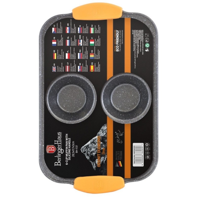 Forma do pieczenia ciastek / muffinów 6 częściowa firmy BERLINGER HAUS z serii GRANIT DIAMOND. Wykonana z blachy stalowej, pokryta nie przywierającą powłoką granitową w kolorze czarnym. Forma wyposażona tak jak cała seria Granit Diamond w silikonowe nakładki na uchwyty. Nakładki te można łatwo zdjąć do pieczenia.