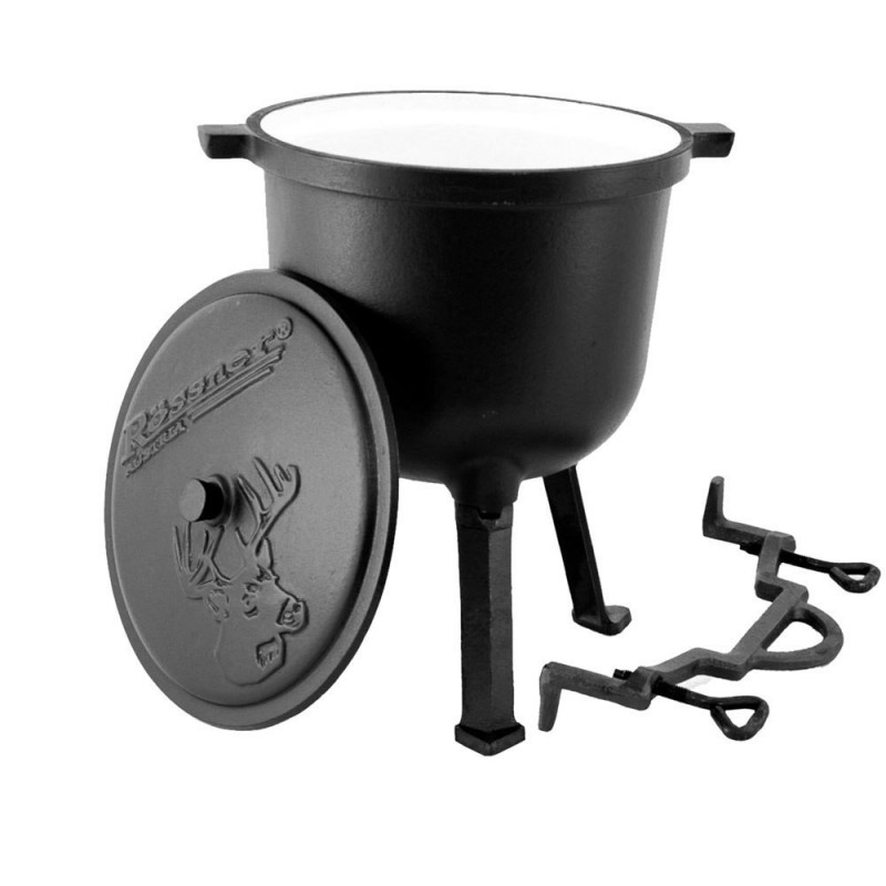 Na rynku możemy znaleźć i te całe żeliwne i żeliwne ze środkiem emaliowanym KOCIOŁKI, często ładnie zdobione myśliwskimi elementami mogą stanowić drugą po grillu atrakcję przygotowania potraw na świeżym powietrzu.