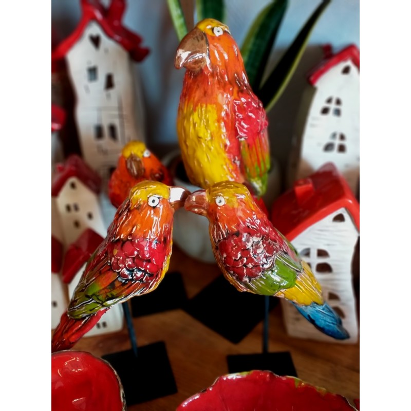 Papugi na stojaku dostępne w różnych kolorach i wielkościach wykonane w Pracowni Ceramiki Artystycznej.