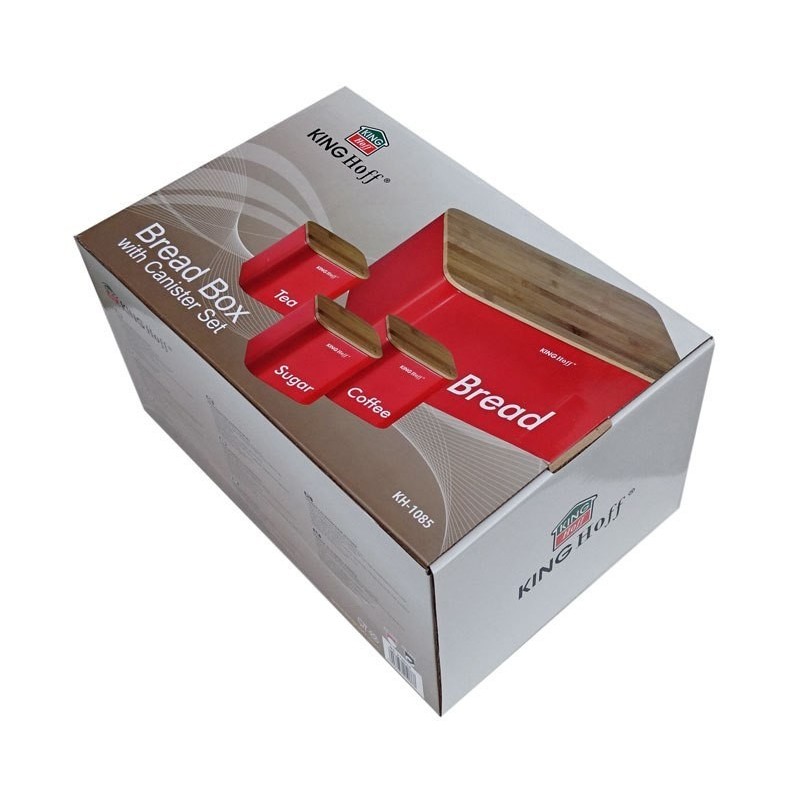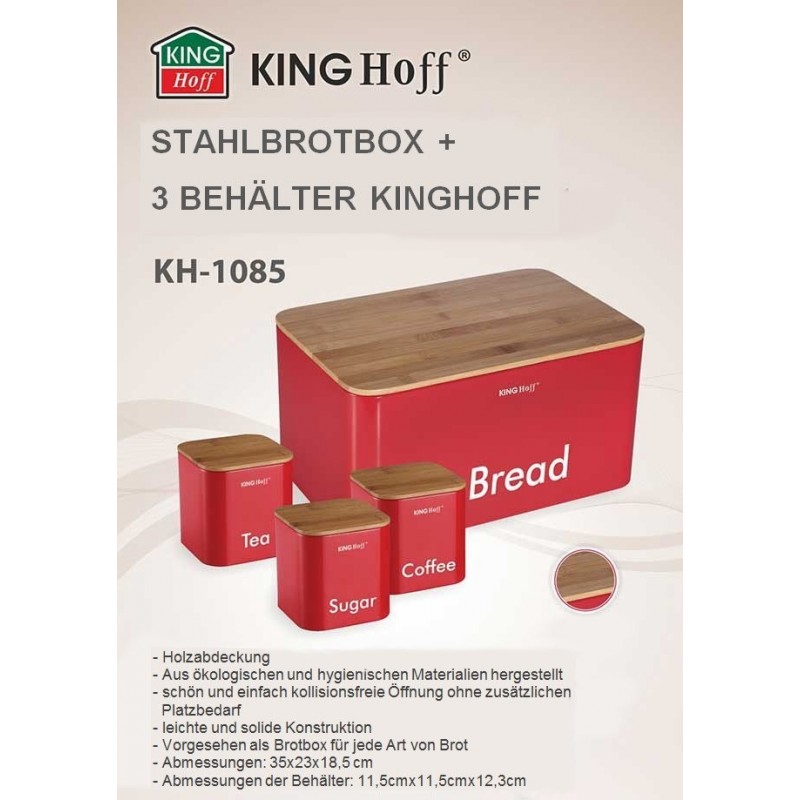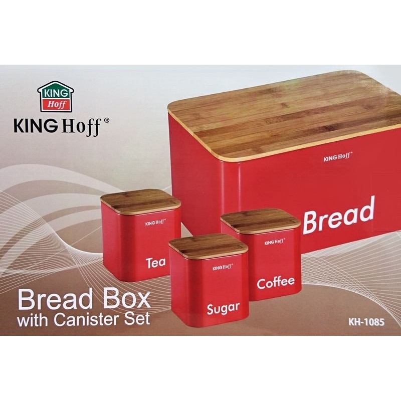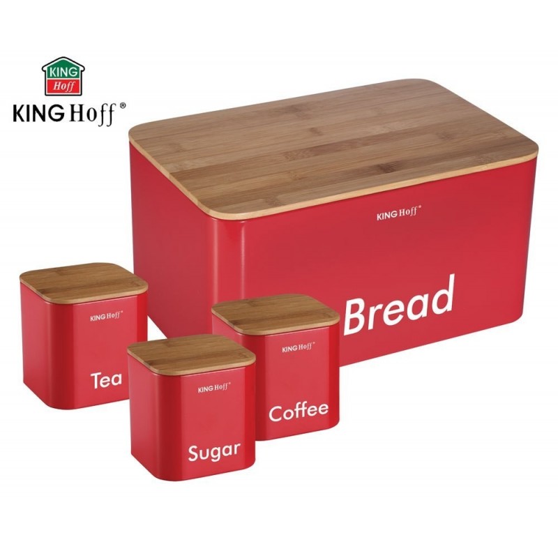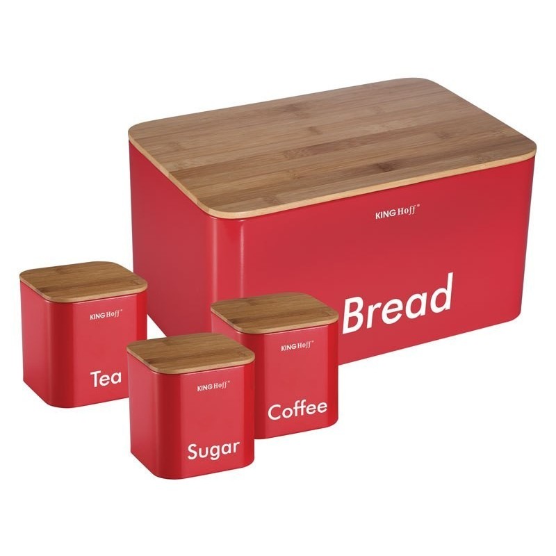 Elegancki zestaw w którego skład wchodzi chlebak oraz 3 pojemniki firmy KINGHOFF. Całość wykonana ze stali nierdzewnej, pokryta półmatowym lakierem. Pokrywa z drewna bambusowego łatwo otwiera się i zamyka oraz jednocześnie pełni funkcję deski do krojenia. Efektowna, praktyczna i zarazem solidna konstrukcja. Pojemniki posiadają szczelne pokrywki (także z drewna bambusowego) tak więc nadają się do szerokiego asortymentu. Podstawowe zastosowanie to herbata, kawa, cukier.