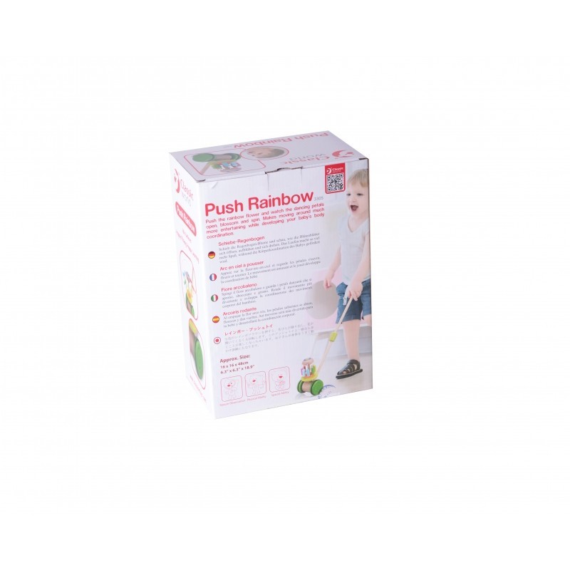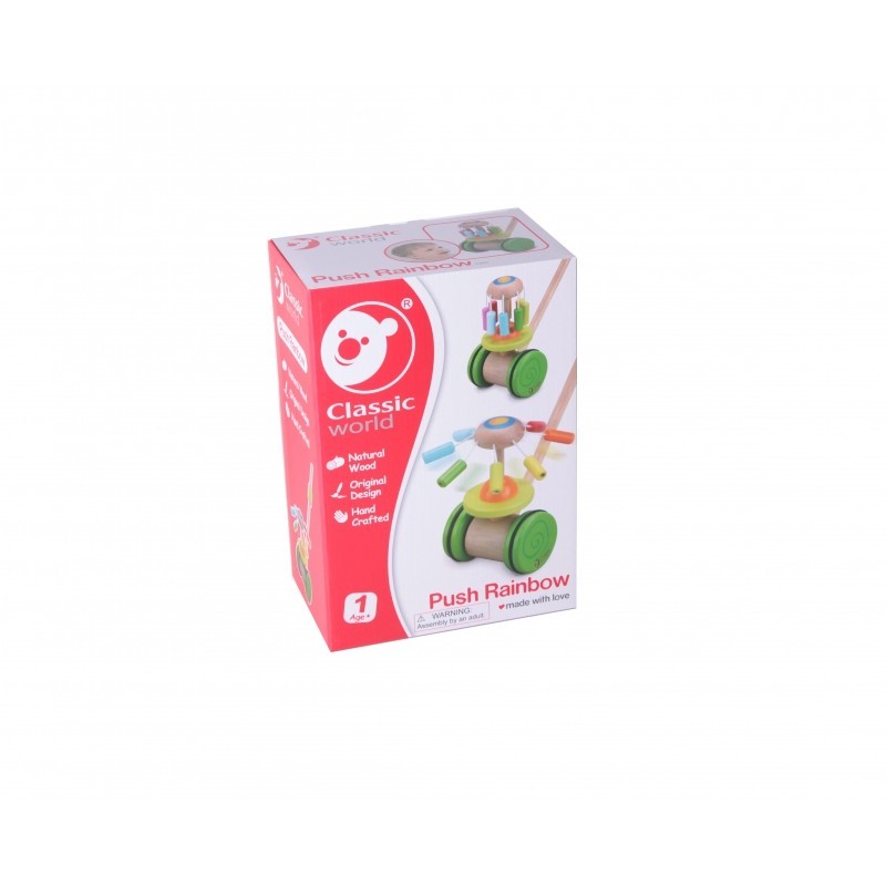 Produkt przeznaczony dla dzieci, które właśnie uczą się stawiać pierwsze kroki. Kolorowy pchacz na pewno zachęci maluszka do doskonalenia techniki chodzenia i umili każdy rodzinny spacer. Dodatkową atrakcją dla malucha jest kolorowa kręcąca karuzelka w kolorach tęczy równocześnie wydająca bardzo przyjemny dźwięk.
