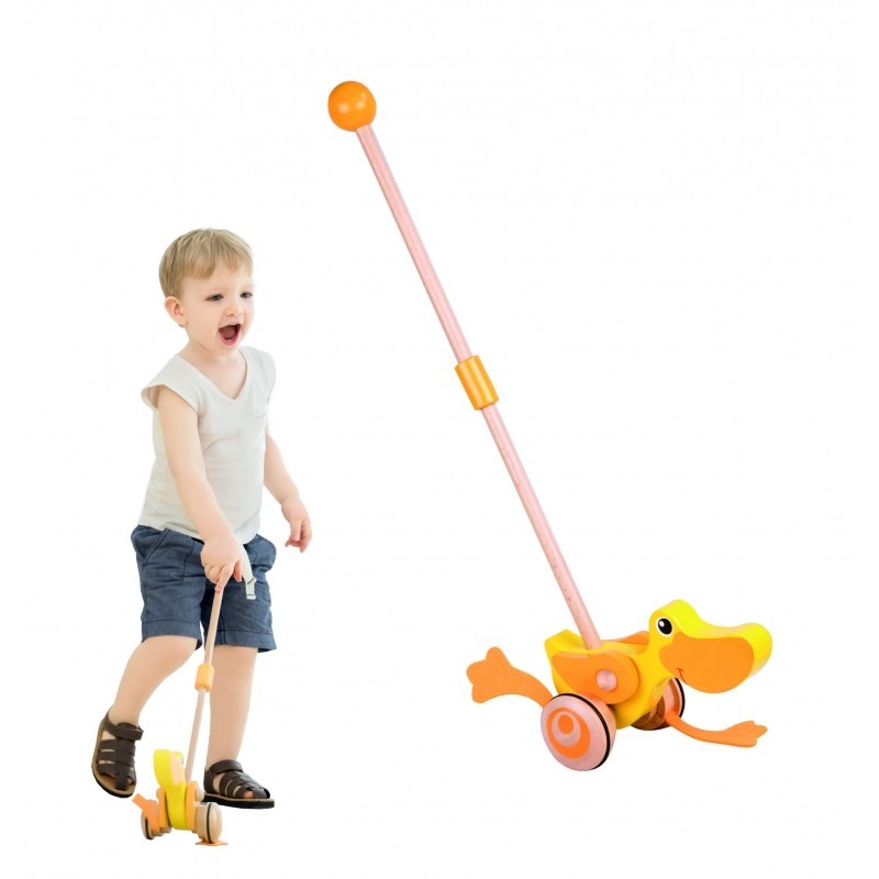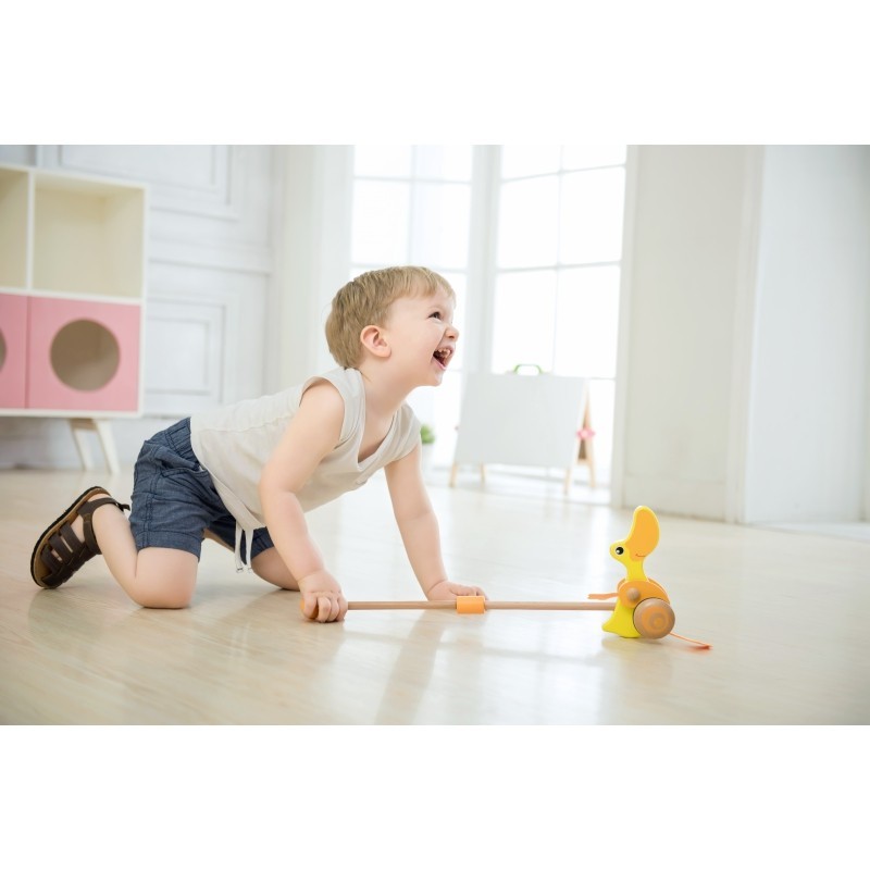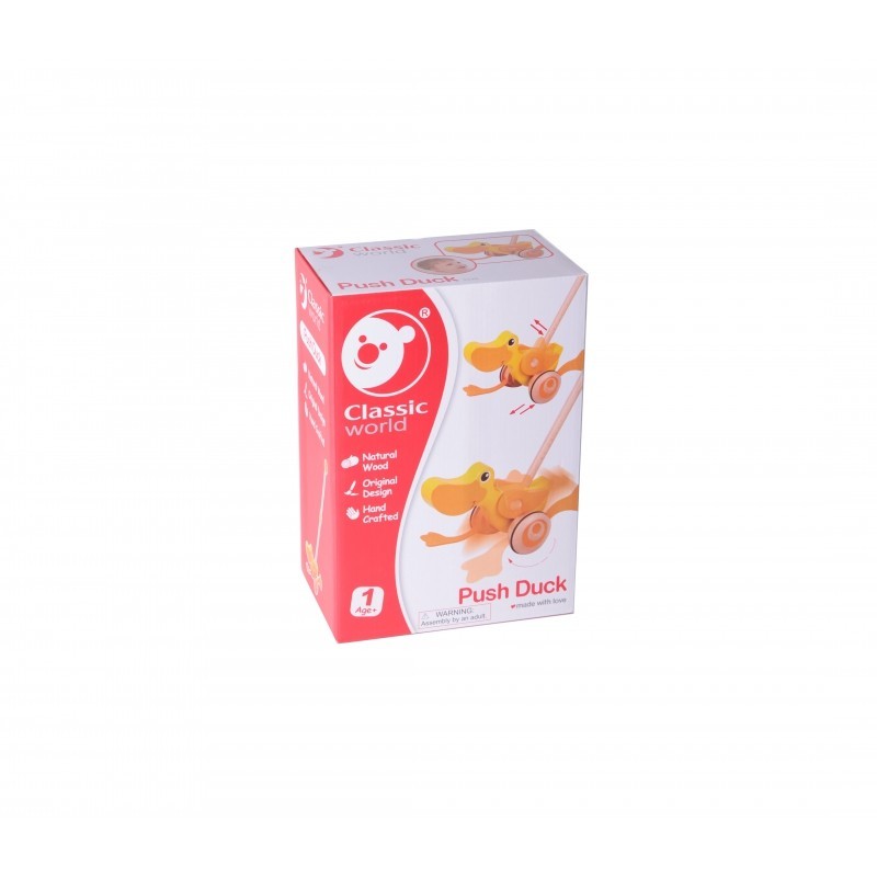 Drewniana zabawka do pchania marki Classic World. Dzieci mogą ćwiczyć chodzenie, prowadząc przed sobą ulubioną zabawkę. Podczas jeżdżenia, kaczuszka klapie płetwami, powodując u maluszka śmiech i radość. Kaczuszka to bestsellerowa zabawka marki Classic World.