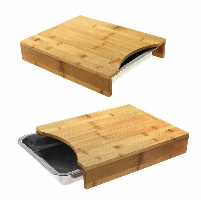 Przydatna w każdym gospodarstwie drewniana deska do krojenia z dodatkowym wysuwanym pojemnikiem.