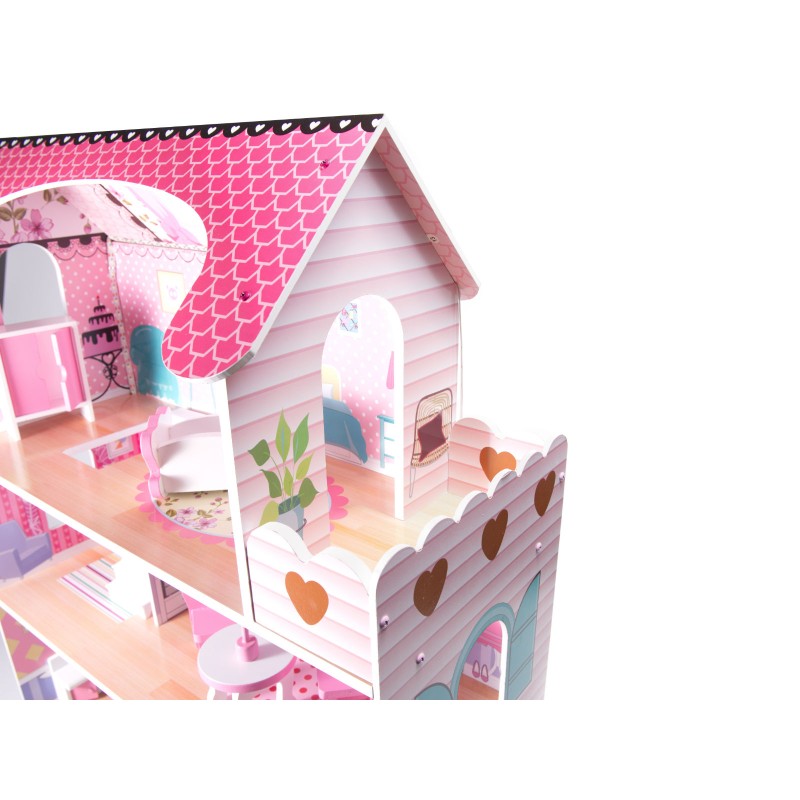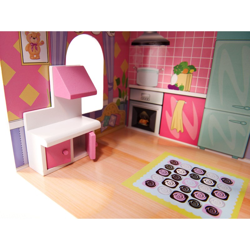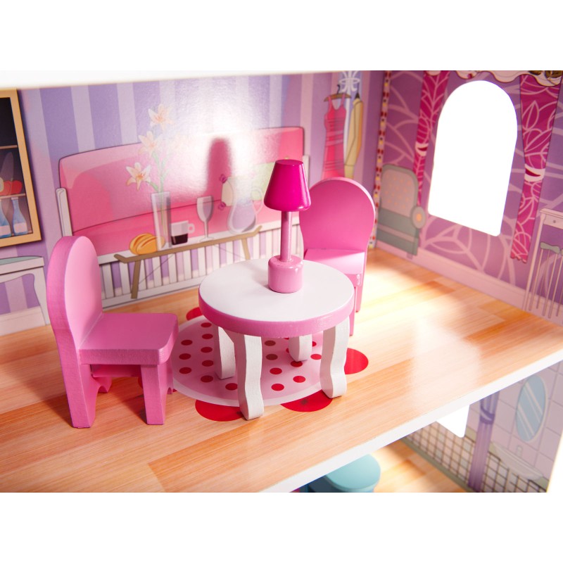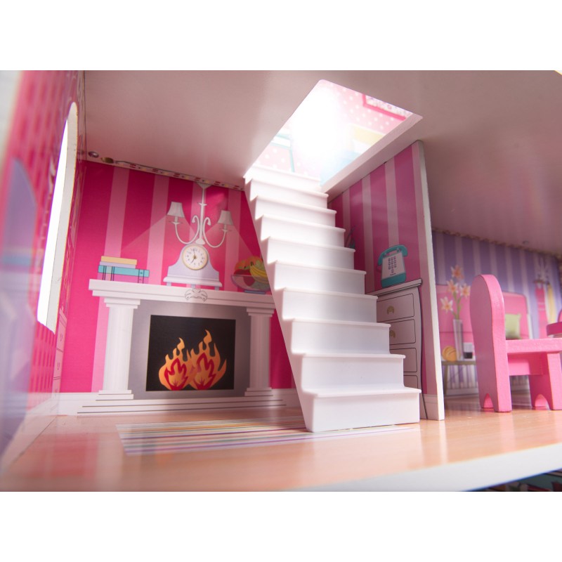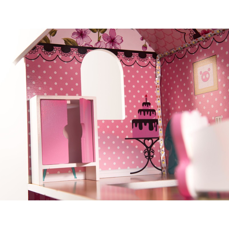 Drewniany domek dla lalek składa się z trzech pięter, na których znajduje się 5 pomieszczeń: kuchnia, łazienka, sypialnia, salon i korytarz. W zestawie znajduje się taśma LED zasilana bateriami AA do zamontowania w domku. Kolorowe grafiki na ścianach oraz duża ilość drewnianych mebelków sprawią, że dzieci będą zachwycone tym domkiem!
