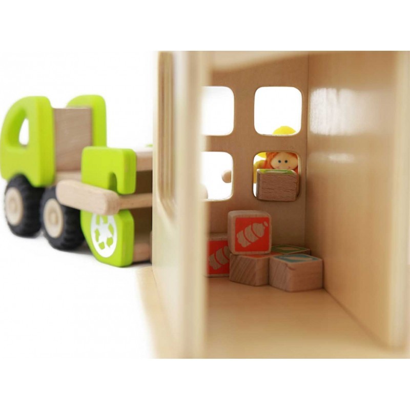 Drewniany zestaw zabawek dla dzieci, które tworzą wspólnie świetną makietę. Komplet zawiera budynek z garażem, który posiada 4 otwory do wrzucania śmieci. Każdy z otworów przeznaczony jest do innego rodzaju odpadów. W zestawie jest również śmieciarka, krzesełko i biurko.