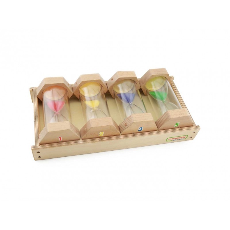 Zestaw składa się z 4 klepsydr. Każda z nich ma piasek o innym kolorze, oraz odlicza inną odległość w czasie. W zestawie znajduje się również drewniana tacka, która służy do przechowywania klepsydr.