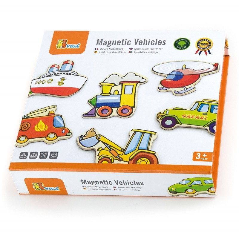 Drewniany zestaw magnesów Pojazdy od firmy Viga Toys zawiera 20 różnych pojazdów