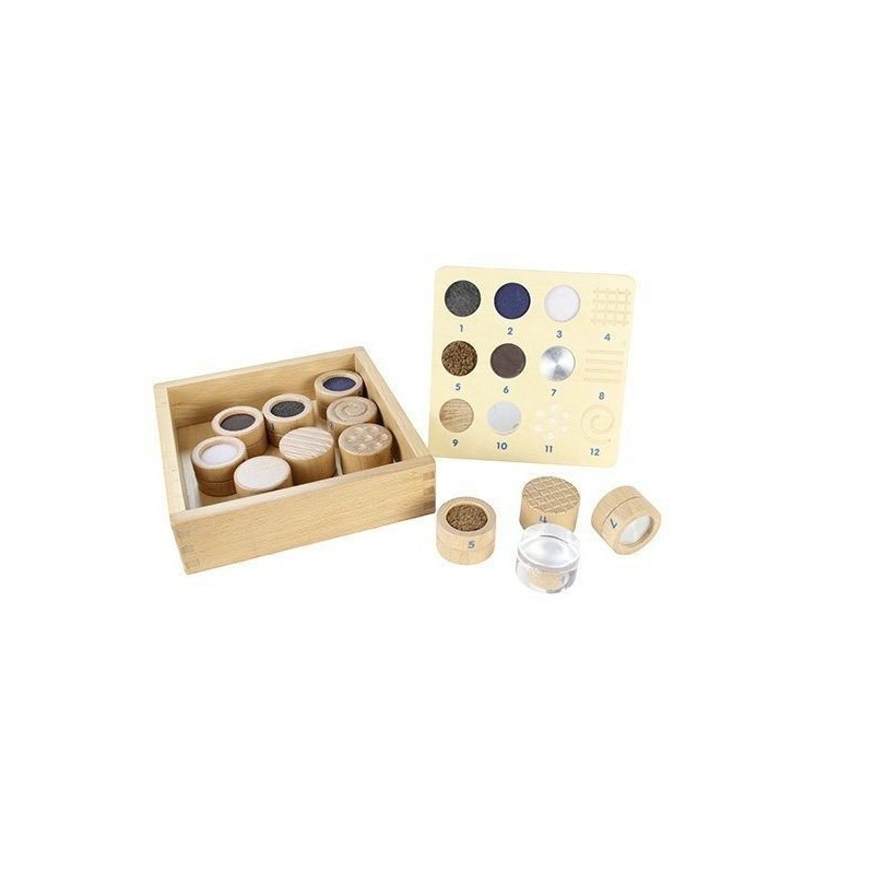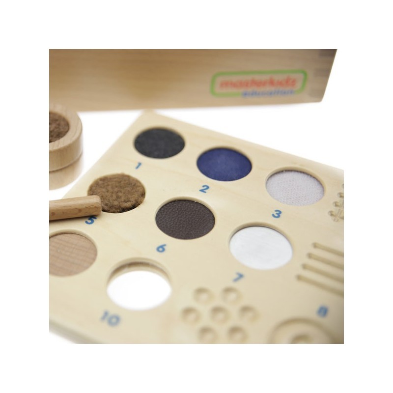 W zestawie znajduje się 7 klocków przedstawiających różne materiały, oraz 5 klocków o różnych fakturach. Rozpoznawanie i zgadywanie powinno odbywać się wyłącznie z użyciem zmysłu dotyku. Częścią zestawu jest drewniana tacka, która służy do przechowywania zabawek.