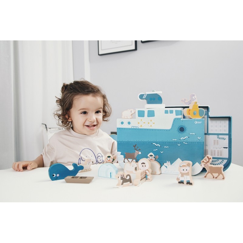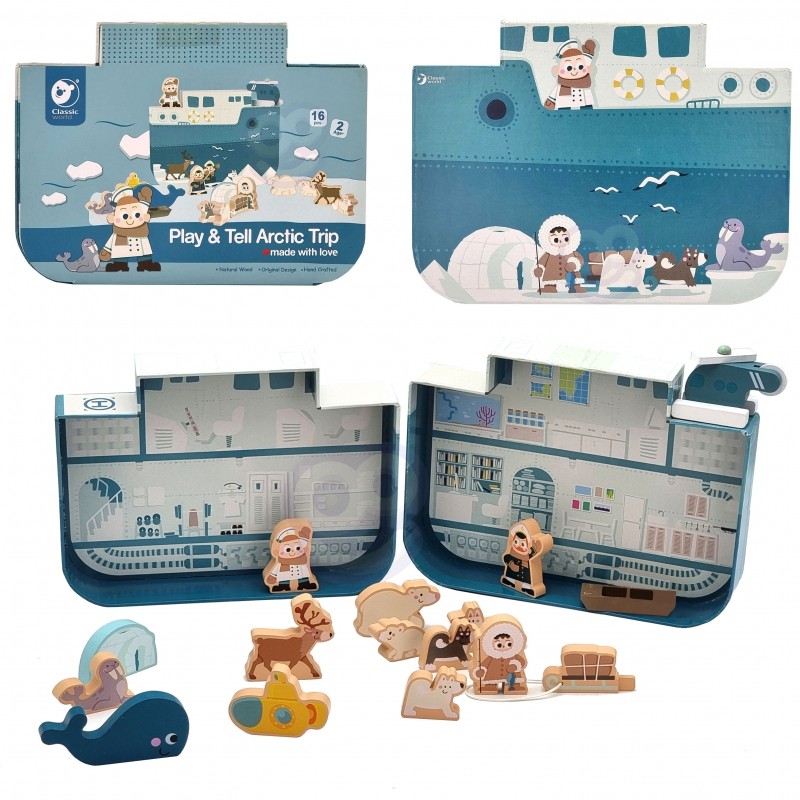 Makieta Arktyczna Przygoda od renomowanej marki Classic World to idealny zestaw dla miłośników arktycznych zwierząt. Zestaw zawiera 16 drewnianych kolorowych elementów. Figurki zwierząt i eskimosów pomogą dziecku poznać życie na Arktyce. Za pomocą wyobraźni i elementów dołączonych do zestawu, dziecko może wymyślać własne historyjki i zabawy. Produkt świetny do zabawy w grupie.