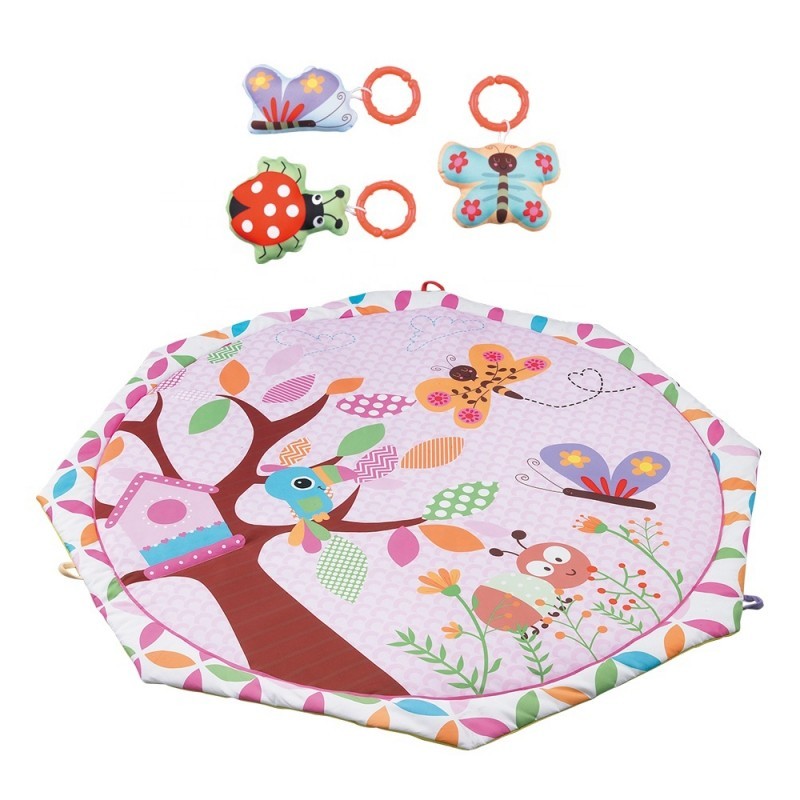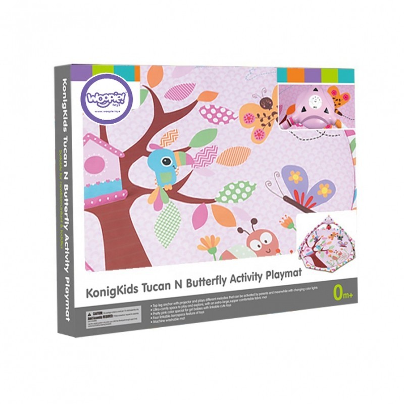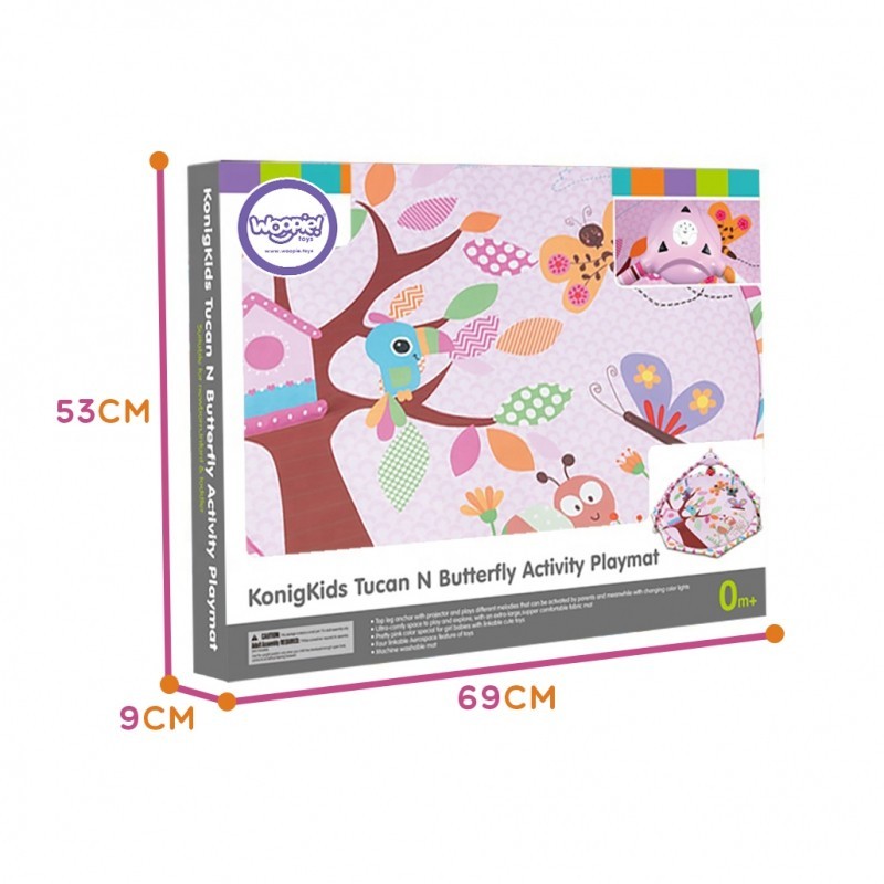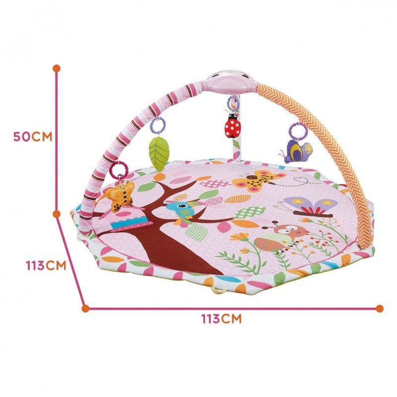 WOOPIE Interaktywna Mata Edukacyjna Dla Dzieci z projektorem wpływa pozytywnie na rozwój wszystkich zmysłów u niemowlaka. Nasza mata to świetne miejsce na relaks, zabawę i odkrywanie świata. Mata dla najmłodszych dzieci o średnicy aż 104 cm, w kolorze różowym ze zwierzaczkami jest idealna dla każdego malucha. Posiada odczepianą pozytywkę z projektorem. Można jej używać razem z matą lub osobno. Do wyboru mamy 8 uspokajających melodii, natomiast projektor wyświetla na suficie gwiazdki i księżyc. Moduł może również emitować kolorowe światełka, które pobudzają ciekawość maluszka. W zestawie znajdują się 4 zabawki (zielony listek, fioletowy motyl grzechotka, biedronka), które pobudzają wszystkie zmysły. Można podwiesić je na pałąkach lub zastąpić innymi zabawkami. Mata jest bardzo łatwa w montażu oraz w czyszczeniu. Miękkie wypełnienie zwiększa poczucie komfortu. Produkt przeznaczony dla najmłodszych dzieci już od 1 miesiąca życia.