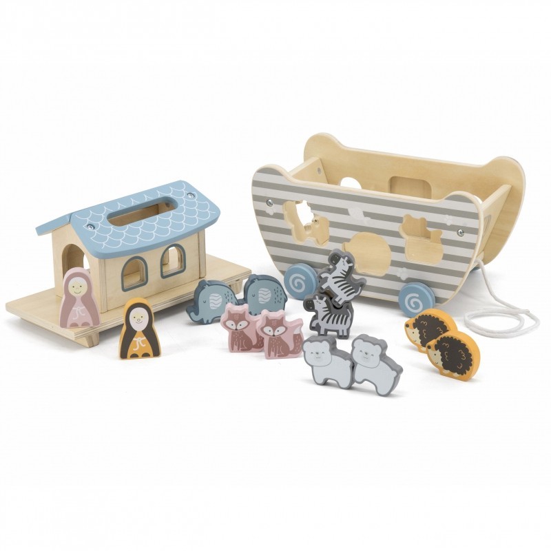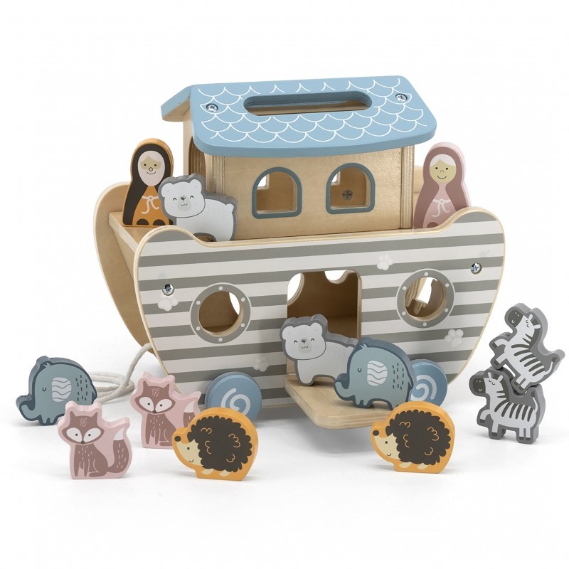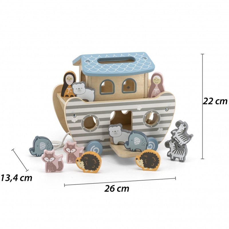 VIGA PolarB Arka Noego Sorter - kolorowy sorter w pięknych pastelowych kolorach to zabawka, którą pokocha każde dziecko. Zestaw zawiera statek, postacie Noego oraz jego żony, jak również figurki 5 różnych par zwierząt. W zabawce zamontowane są otwierające się drzwi, dzięki którym wszyscy pasażerowie mogą dostać się na pokład. Łódka dodatkowo posiada uchwyt do przenoszenia. Produkt przeznaczony dla powyżej 2 roku życia. Piękne wykonanie i kolorystyka zainteresuje z pewnością każdego malucha!