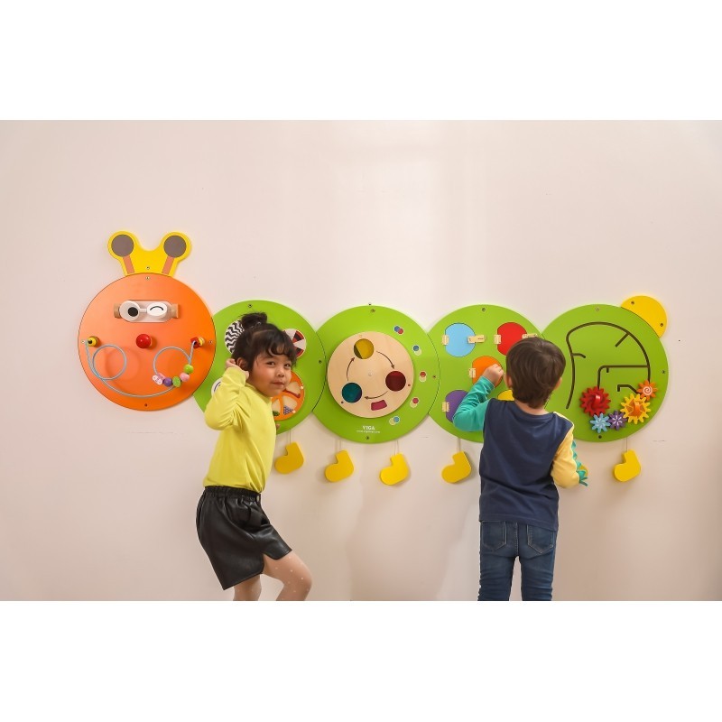 Wielofunkcyjna tablica ścienna z uroczym wizerunkiem gąsienicy. Zestaw składa się z 5 tablic z różnymi funkcjami. Tablice są bardzo łatwe w montażu i demontażu, jak również w transporcie. Tablica z wizerunkiem gąsienicy jest zabawką, na której jednocześnie może się bawić kilkoro dzieci. Mogą nie tylko bawić się dla przyjemności, ale także wiele się nauczyć. Pomaga w nauce kolorów, dźwięku, grafiki. Rozwija również koordynację ręka-oko oraz umiejętności społeczne. Genialna kombinacja zabawek dla szkół, przedszkoli, centrów nauki oraz miejsc publicznych. Produkt przeznaczony dla dzieci powyżej 18 miesiąca życia.