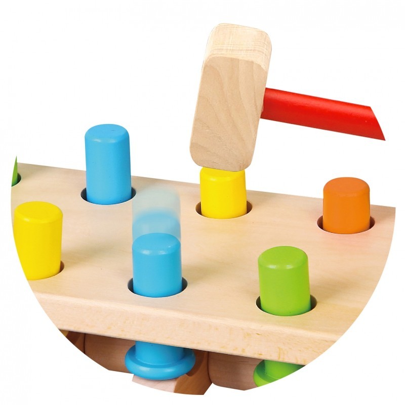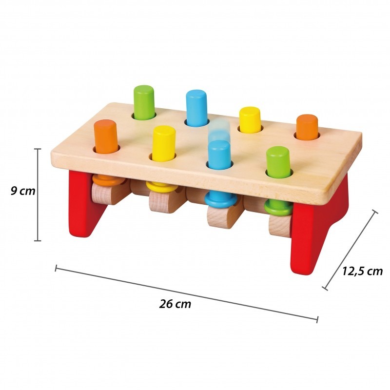 Drewniana ławeczka składa się z deski z otworami, przez które przebijamy, za pomocą drewnianego młotka, klocki w kształcie walców. Takie ćwiczenia doskonale wpłyną na rozwój umiejętności manualnych i koordynację ręka-oko, a także wyobraźnię pociechy. Teraz zacznie się prawdziwa zabawa! Zaczynamy!