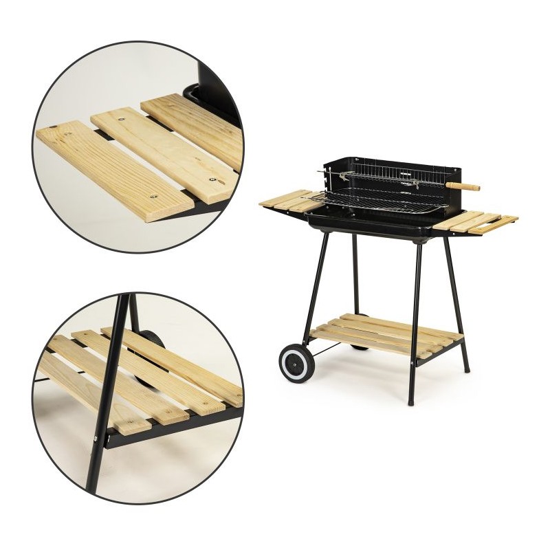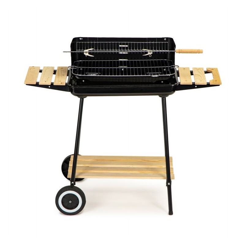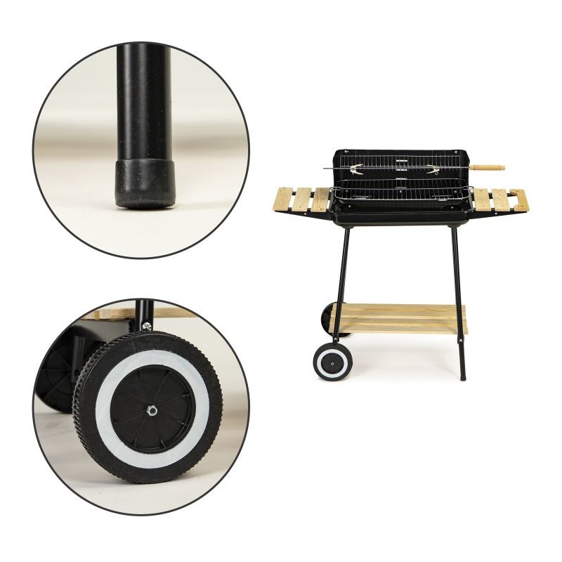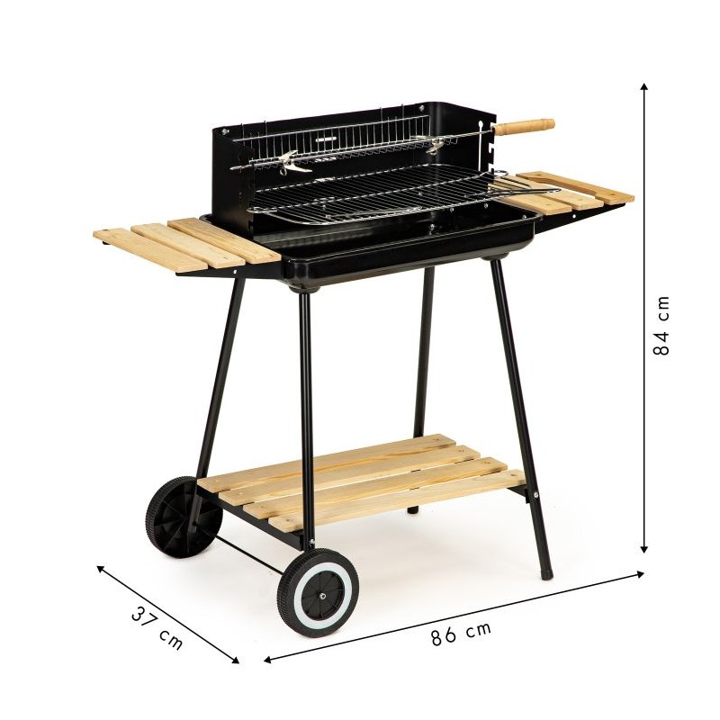 Grill cechuję się stabilną metalową konstrukcją o wymiarze: 86x37x84 cm, która zapewnia bezpieczeństwo podczas przyrządzania posiłków. Grill można bez problemu transportować, nawet gdy jest rozgrzany, ponieważ posiada wbudowane dwa kółka oraz drewnianą rączkę. Drewniane półki pozwalają na trzymanie wszystkich niezbędnych akcesoriów pod ręką. Dużą powierzchnie grillowania zawdzięczamy chromowanemu rusztowi o wymiarze 52x32 cm.