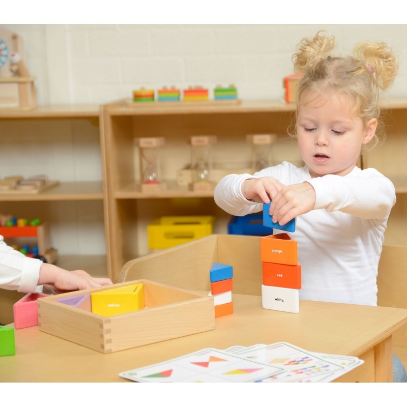 Zabawka sensoryczna edukacyjna, zestaw kolorowych klocków i kubeczków, które można układać jeden w drugim. Zabawki podzielone są na 9 kolorów, a kubeczki są dodatkowo podpisane. Jest to świetna pomoc w nauce kolorów, oraz motoryki małej. W zestawie znajdują się karty z wyzwaniami i grami dla dzieci z użyciem klocków i kubeczków