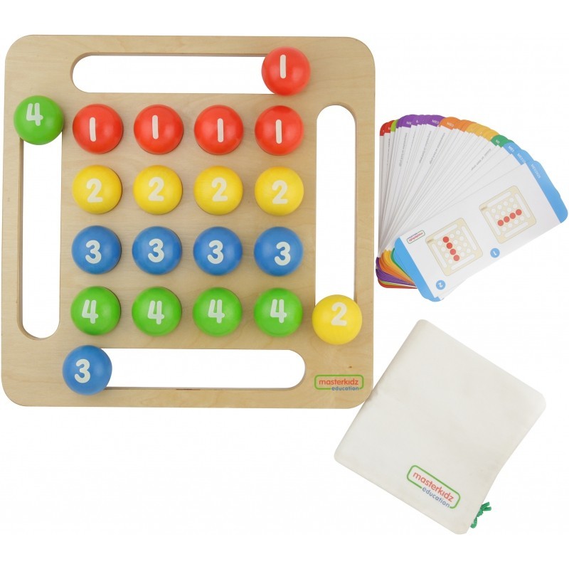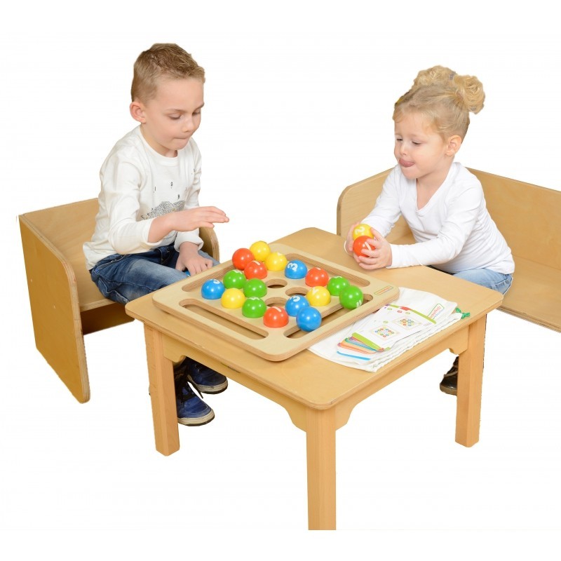 Arcyciekawa drewniana zabawka gra dla dzieci. Zadaniem grającego malucha jest wykorzystanie kolorowych kulek do ułożenia określonego schematu. Schematy opisane są na specjalnych kartach załączonych do gry. Gra jest genialnym sposobem na rozwinięcie umiejętności logicznego myślenia, ale sprawia również mnóstwo frajdy. Można w nią grać godzinami i na pewno się szybko nie znudzi.