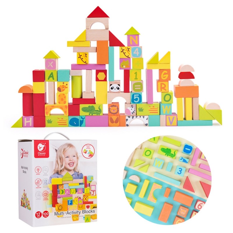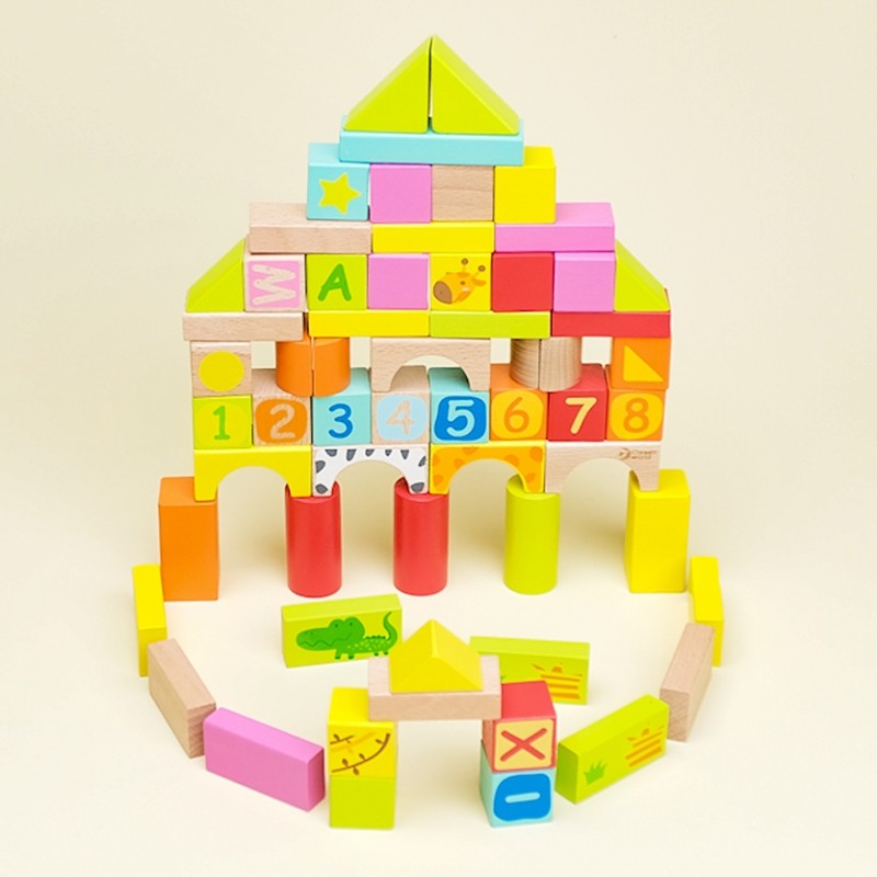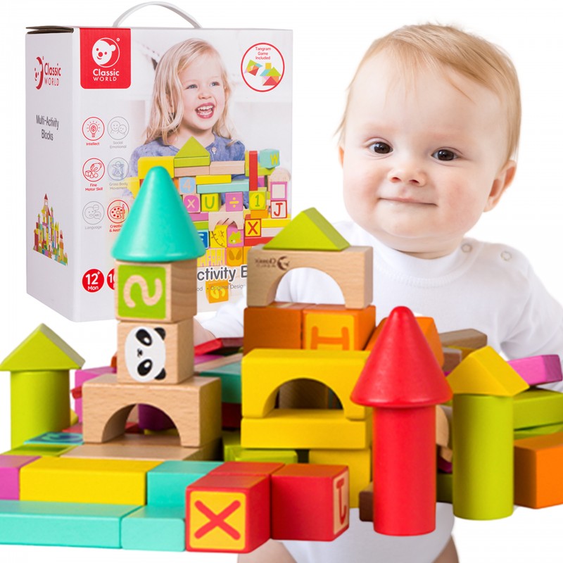 Mega zestaw klocków w zestawie wieloma różnymi elementami. Na klockach znajdują się literki cyfry,zwierzęta. Klocki to nieskończona ilość zabawy i nauki.