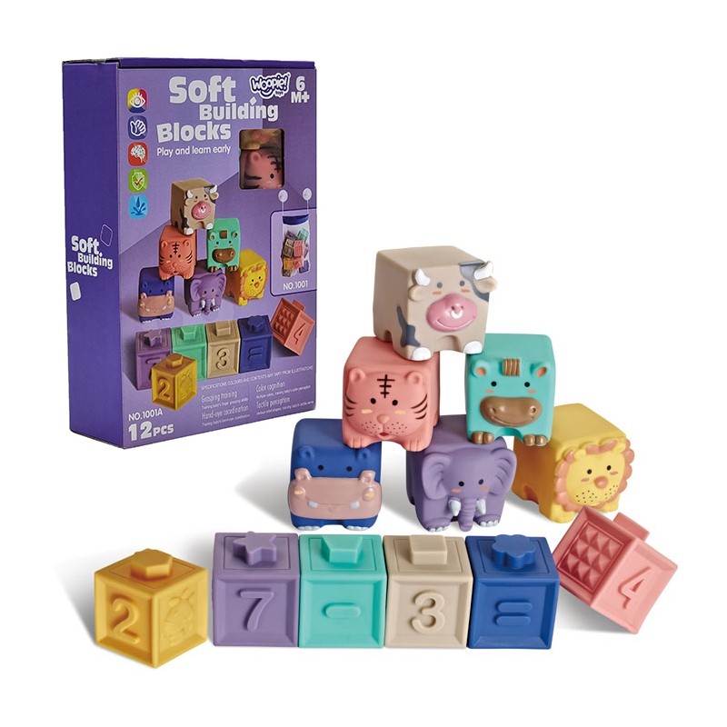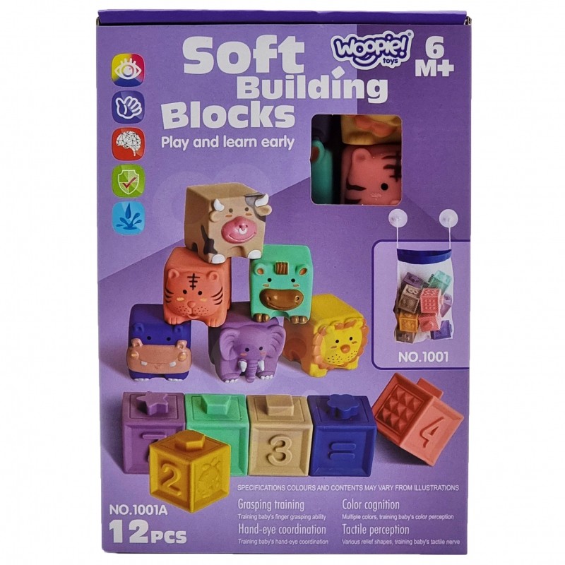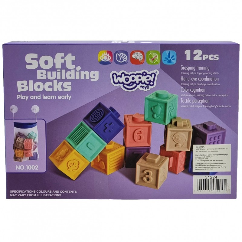 WOOPIE Układanka Klocki Sensoryczne zaciekawią każdego malucha. Dzięki ciekawym kształtom i kolorom doskonale stymulują rozwój koordynacji wzrokowo-słuchowej, motorycznej dziecka oraz zmysłu dotyku. Klocki posiadają wypukłe kształty z cyframi i znakami matematycznymi, teksturami/wzorami, wizerunkiem zwierząt, kształtami geometrycznymi oraz owocami. Dodatkowo klocki można ze sobą łączyć. Klocki są miękkie i przyjemne w dotyku oraz wydają dźwięki podczas ściskania. Dzięki swojej budowie sprawdzą się również doskonale jako gryzak. Można używać i myć w wodzie. Klocki dodatkowo maja wartość edukacyjną jak nauka liczenia, dzięki możliwości wykonania prostych działań matematycznych. Dodatkowo dzięki wizerunkom zwierząt dziecko może zapoznać się ze światem przyrody. Produkt w pięknej stonowanej kolorystyce przeznaczony dla dzieci od 6 miesiąca życia.