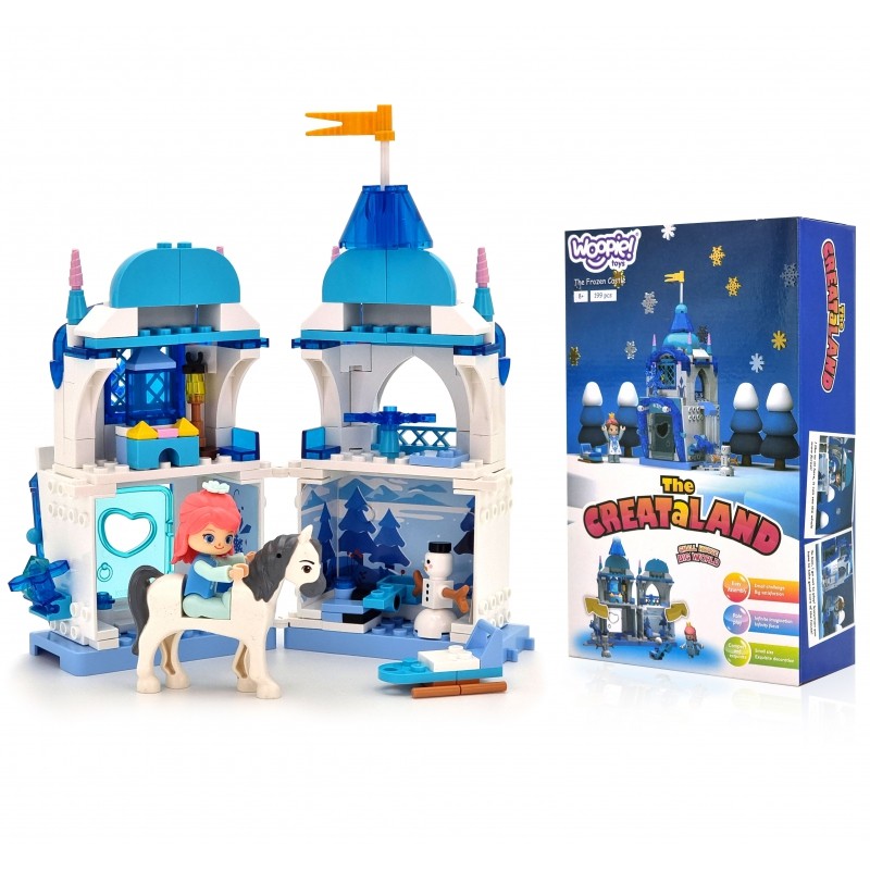 Klocki dla Dzieci Zamek Lodowa Kraina od marki WOOPIE dostarczą nieskończona ilość możliwość zabawy oraz wspaniałych historii. W skład zestawu wchodzi 199 klocków, w tym postać księżniczki i jej przyjaciela bałwanka. Do zbudowania jest zamek wraz z jego zawartością. Ciekawymi realistycznymi elementami są m.in. łóżko czy armatka do zabawy śniegiem. Zamkiem można się bawić w 2 pozycjach - możliwe jest rozłożenie zamku w celu zabawy wewnątrz zamku. Budując świat oraz wcielając się w postacie, dziecko rozwija wyobraźnie i kreatywność, koncentrację, ćwiczy zdolności motoryczne ("małą motorykę") i językowe, a odgrywanie scenek i tworzenie własnych historii zabawy pozwala, także pobudzić świadomość społeczną oraz inteligencję emocjonalną u najmłodszych.