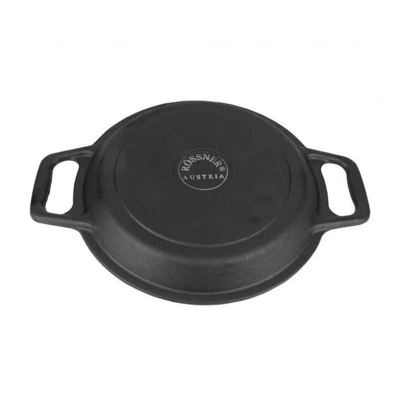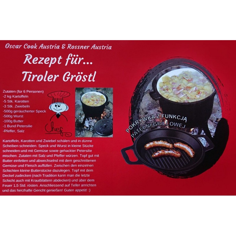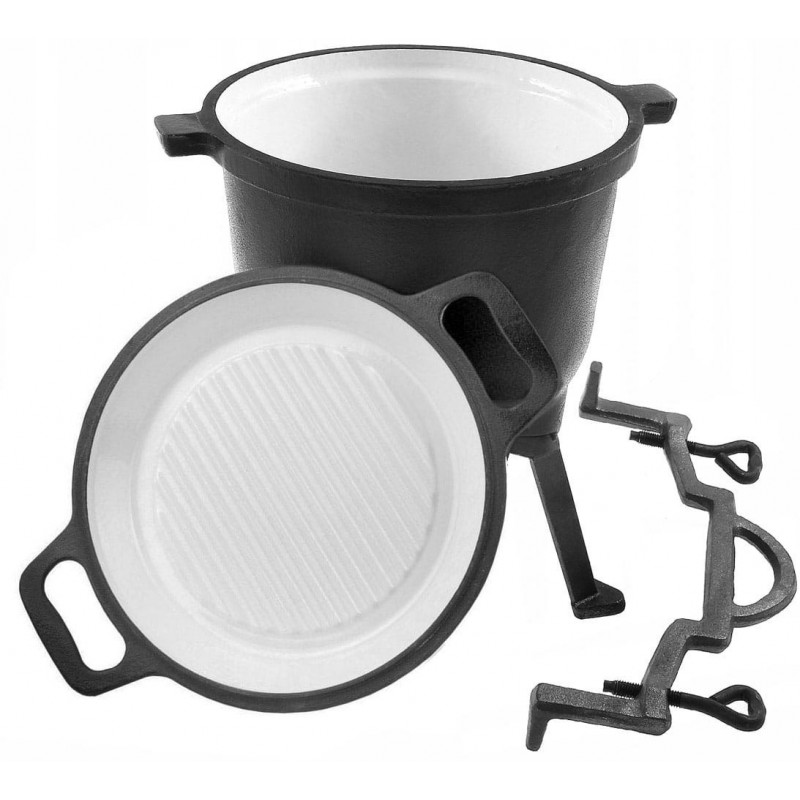 Kociołek żeliwny emaliowany z patelnią grillową myśliwski o pojemności 11L firmy ROSSNER wykonany z żeliwa szarego, oksydowany z zewnątrz oraz emaliowany wewnątrz.