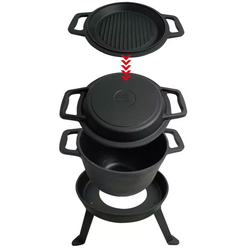 - W zestawie pokrywka z funkcją patelni grillowej, podstawa z dokręcanymi nóżkami, żeliwny kociołek,- Łatwy w utrzymaniu w czystości.