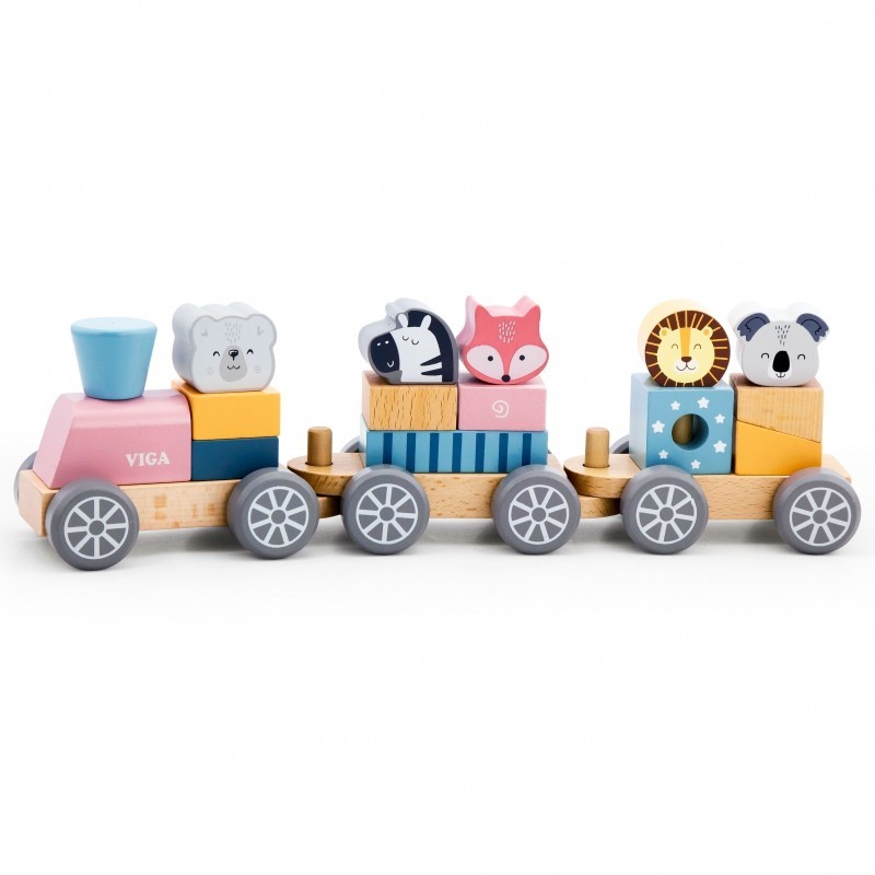 - - Zabawka składa się z lokomotywy i kilku wagonów oraz klocków z podobiznami zwierzątek.
