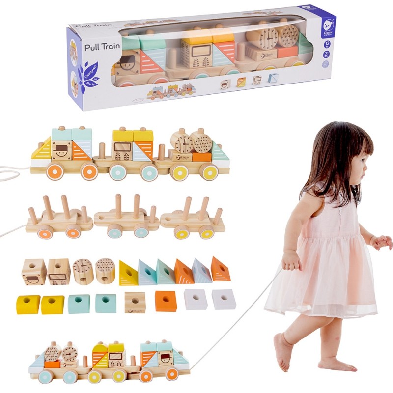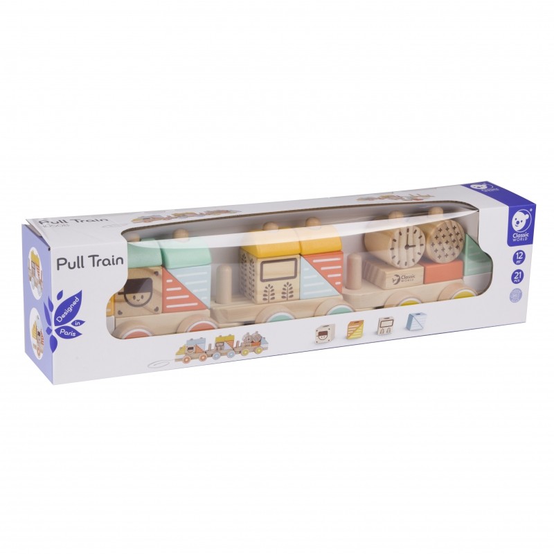 CLASSIC WORLD Drewniany Pociąg do Ciągnięcia to piękny, solidnie wykonany produkt, który ucieszy każdego malucha. Zabawka pobudza kreatywność oraz wyobraźnie! Nasza pociecha może w dowolny sposób zaprojektować pociąg z dołączonych klocków i wyruszyć w podróż nim. Pastelowe kolory przykują uwagę każdego małego podróżnika! Produkt składa się z 16 klocków, oraz z trzech wagonów, które w dowolny sposób można łączyć i ustawiać. Zabawka rozwija koordynację ruchu dziecka i ciekawość poznawania świata. Przeznaczony dla dzieci powyżej 10 miesiąca życia.