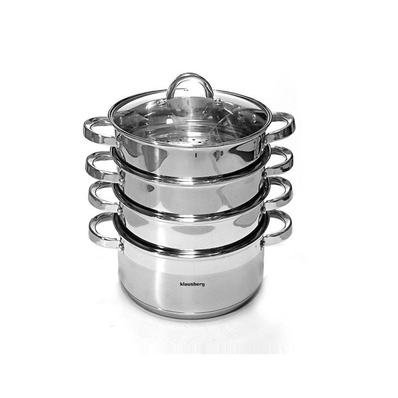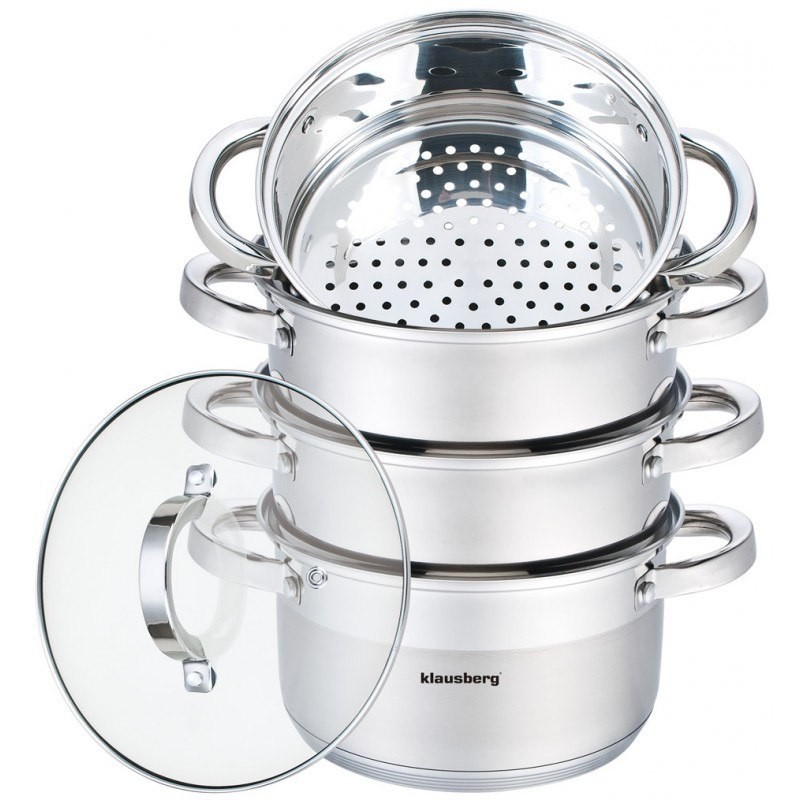 5 częściowy komplet garnków do gotowania na parze KLAUSBERG bazujący na garnku 2.5L / Ø18cm. Zestaw wykonany z wysokiej jakości stali nierdzewnej. Wykorzystana stal składa się z najlepszej jakości stopu powszechnie stosowanego w światowej klasy produktach, co gwarantuje jej wysoką odporność na korozję oraz bardzo dobrą wytrzymałość. Zastosowany materiał umożliwia szybkie podgrzanie potraw i przez dłuższy czas utrzymuje ciepło.