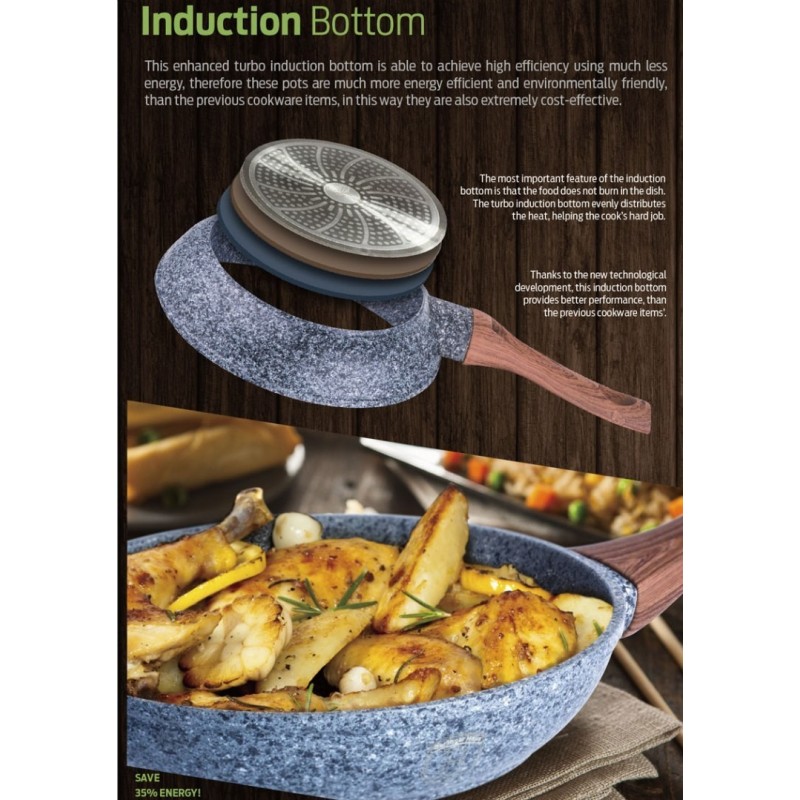 Kompozycja aluminiowego korpusu i ferromagnetycznego dna umożliwia użytkowanie na kuchni indukcyjnej oraz na wszystkich innych rodzajach kuchni i wykorzystywania najlepszych właściwości akutermicznych odlewanego i kutego aluminium na wszystkich kuchenkach i płytach grzewczych. Możliwość gotowania/smażenia w temperaturze do 220°C.