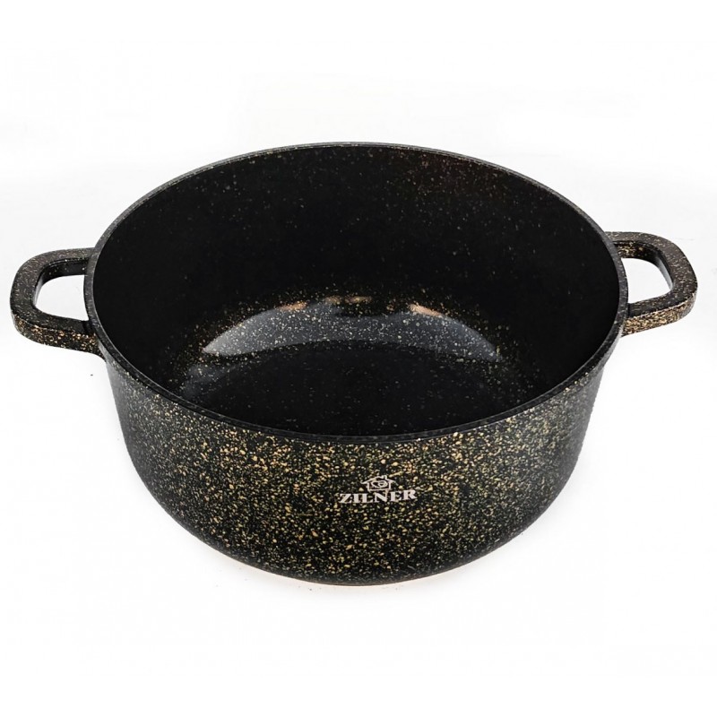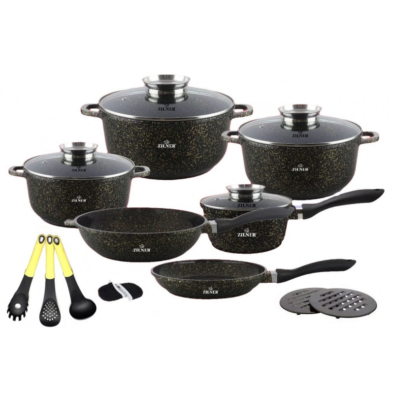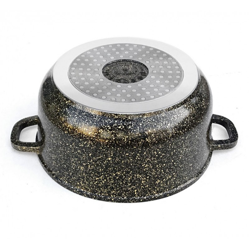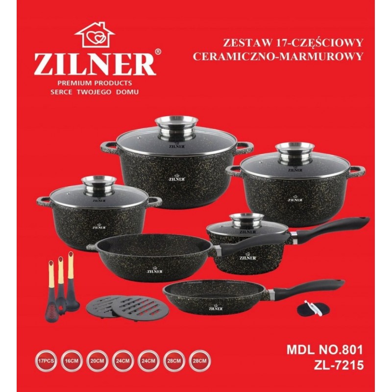 17 elementowe garnki wykonane z odlewanego stopu aluminiowego z CERAMICZNĄ anty-przywierającą powłoką domieszką miału granitowego (marble) wykonaną w procesie nanotechnologii tworząc niezwykle gęstą, zwartą oraz gładką warstwę na powierzchni.