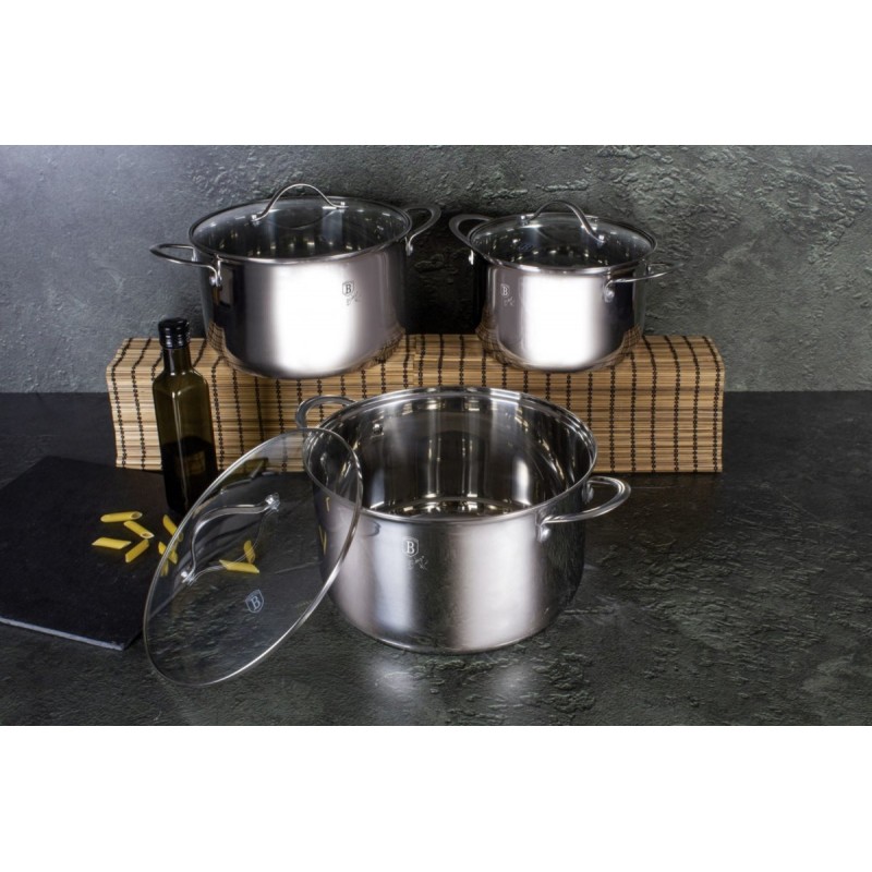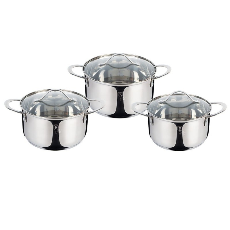Zestaw garnków (6 elementów) firmy BERLINGER HAUS z linii Silver Jewellery z wielowarstwowym dnem akutermicznym wykonany z najwyższej jakości stali chromowo-niklowej. Stal chromowo-niklowa z której wykonano zestaw jest nierdzewna, wytrzymała i długowieczna. Zastosowany materiał świetnie się prezentuje i jest wyjątkowo łatwy w czyszczeniu oraz posiada właściwości bakteriobójcze. Wielowarstwowe dno akutermiczne (5mm) gwarantują doskonały rozdział i magazynowanie ciepła. Z uwagi na swoje wyjątkowe cechy garnki te nadają się również do gotowania z minimalną ilością wody i tłuszczu. Garnki można używać na wszystkich rodzajach kuchenek, także indukcyjnych. Nitowane uchwyty gwarantują długotrwałe i bezpieczne użytkowanie. Skala pomiarowa wewnątrz każdego garnka ułatwia dozowanie wymaganej ilości wody lub innych składników przygotowywanego dania.