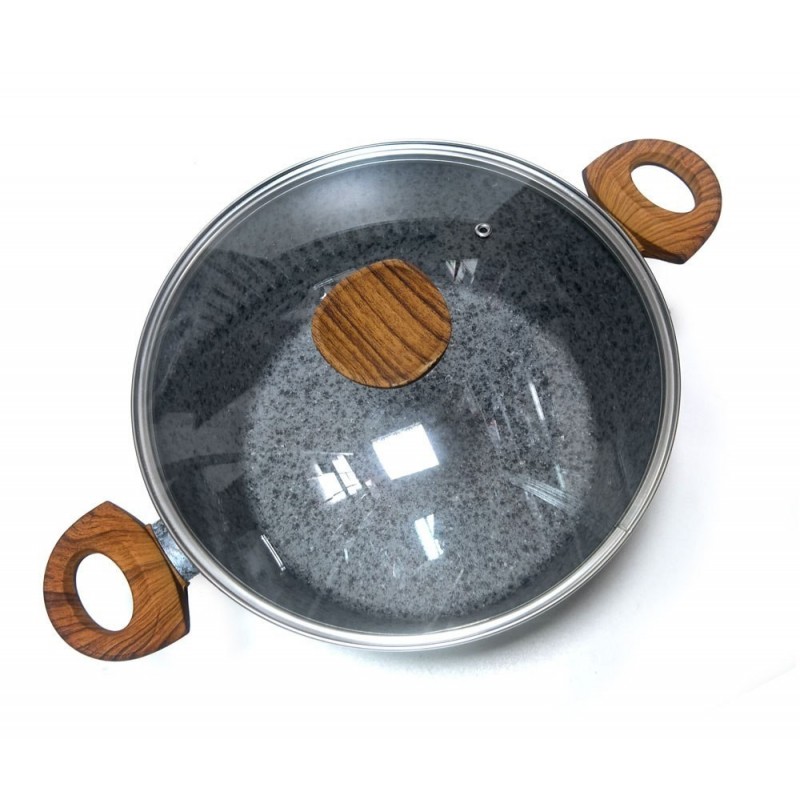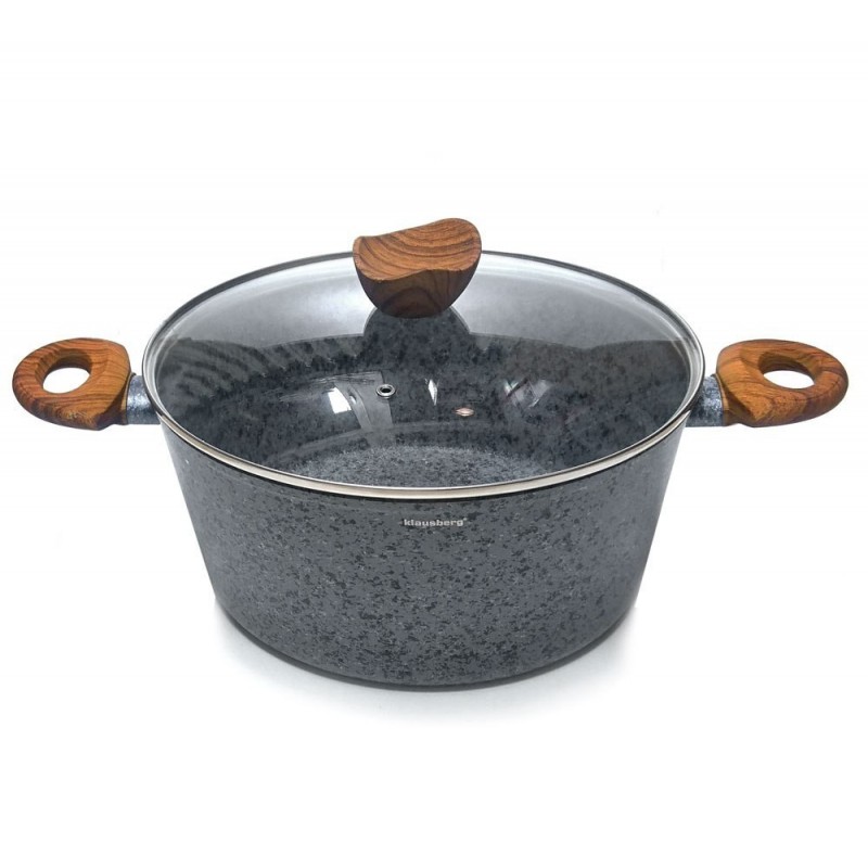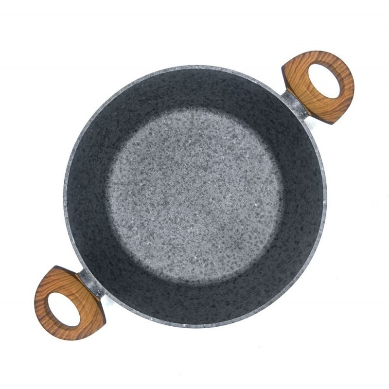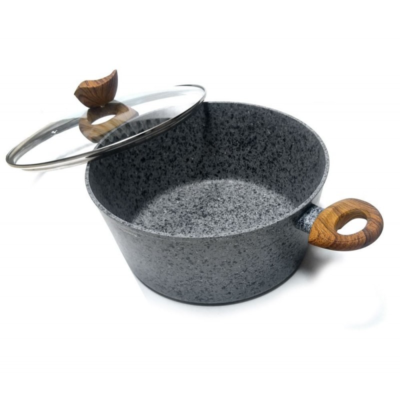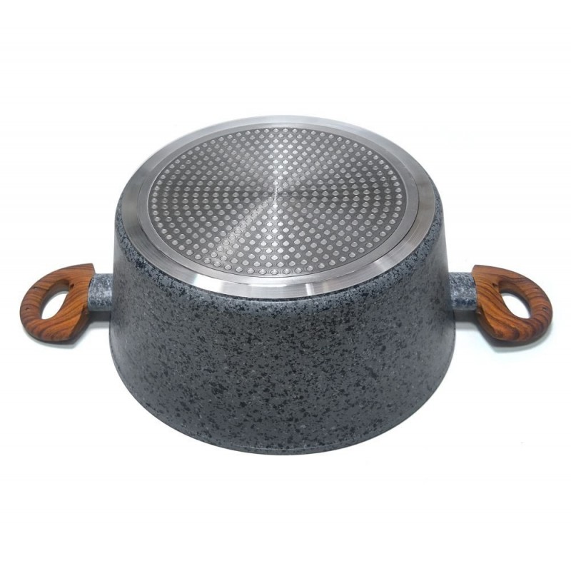 Garnki wykonane ze stopu aluminiowego formowanego metodą odlewania (cast aluminium). Można w nich przygotować pyszne i zdrowe potrawy, które nie utracą soczystości i walorów odżywczych. Powłoka nieprzywieralna bardzo wiernie imituje kamień, posiada odcień w kolorze matowym. Uchwyty wykonane z nienagrzewającego się tworzywa sztucznego imitującego drewno, powleczone cieniutką warstwą silikonu. Wszystkie naczynia w zestawie wyposażone są w dno ferromagnetyczne dzięki któremu można używać te aluminiowe garnki na płytach indukcyjnych. Bardzo atrakcyjny zestaw w aktualnie modnym trendzie.