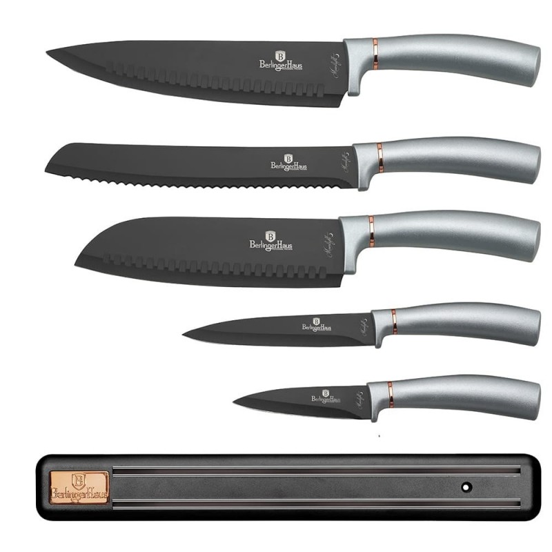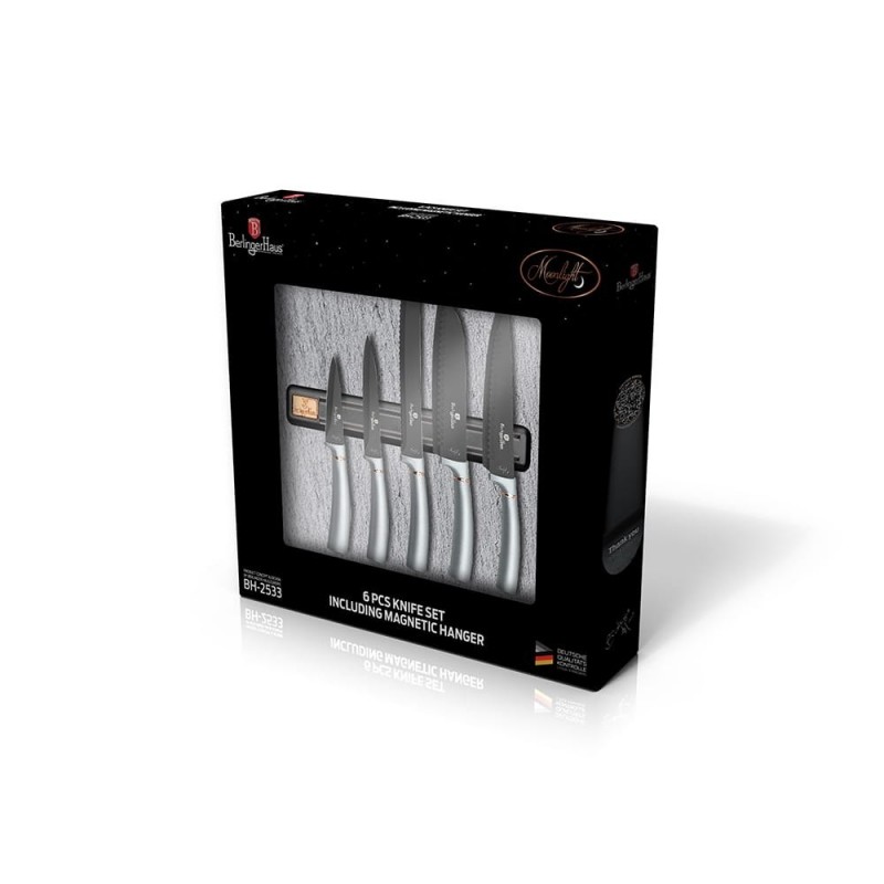 Zestaw noży 6 elementów firmy BERLINGER HAUS z serii MOONLIGHT. Noże ze stali nierdzewnej dodatkowo pokryte powłoką anty-przywierającą wysokiej klasy. Wyposażone w uchwyty pokryte bardzo trwałą cienką warstwą silikonu dla uzyskania pewnego trzymania w każdych warunkach. Całość znajduje się w efektownym pudełku kartonowym z wytłoczką z pianki, zamykana na magnes.