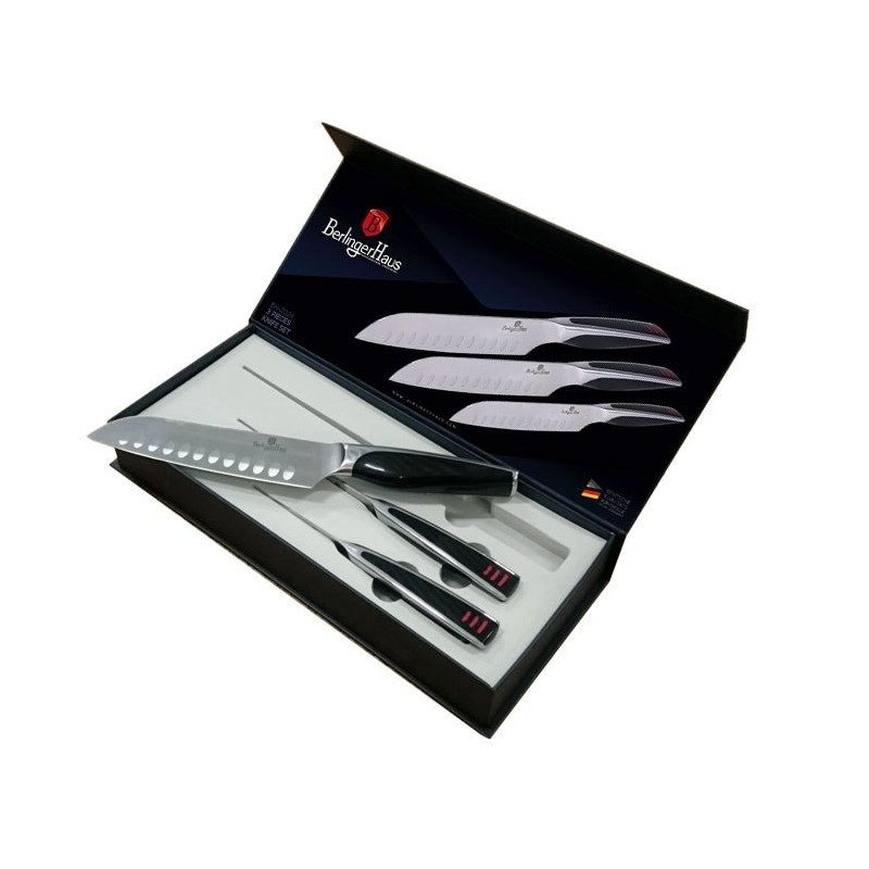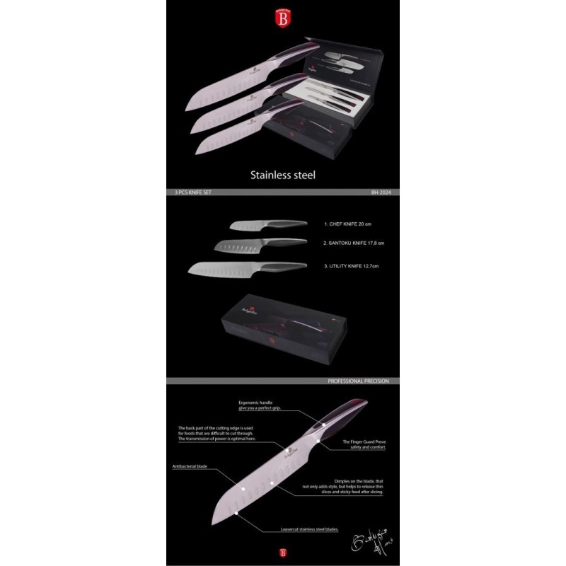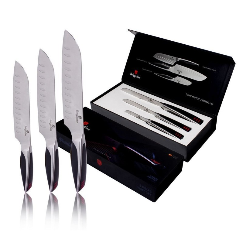 Zestaw 3 noży typu azjatyckiego SANTOKU firmy BERLINGER HAUS PHANTOM. Przeznaczone do porcjowania mięsa i ryb oraz siekania warzyw. Noże wykonane z wysokogatunkowej nierdzewnej stali japońskiej. Masywne, z okładziną semi-perłową.