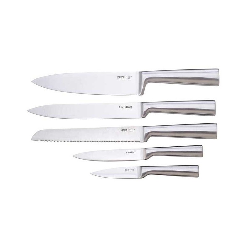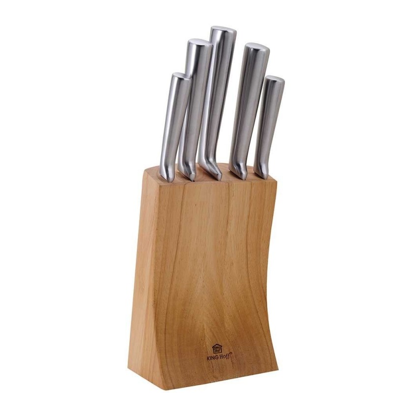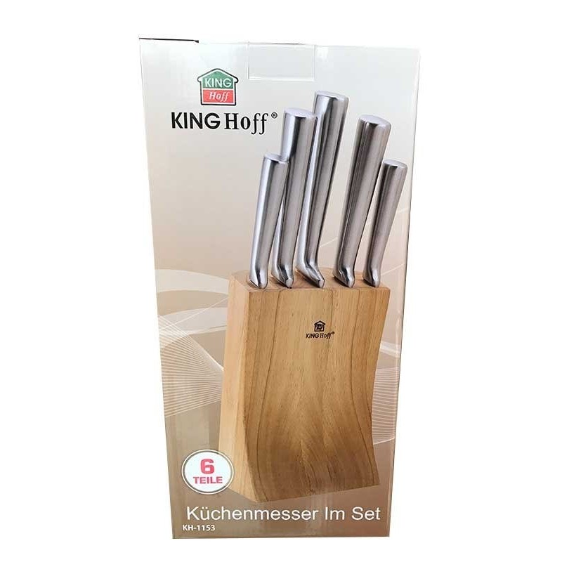 6 elementowy zestaw noży w bloku firmy KINGHOFF. Przeznaczone do porcjowania mięsa i ryb, krojenia pieczywa oraz obierania i siekania warzyw.