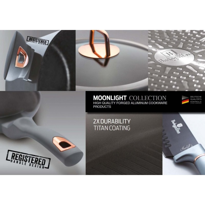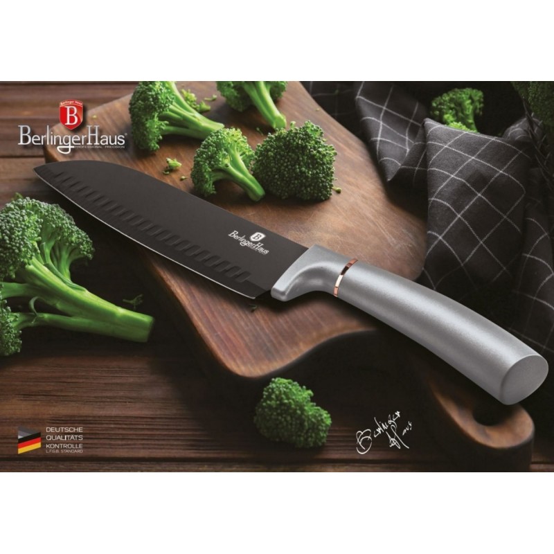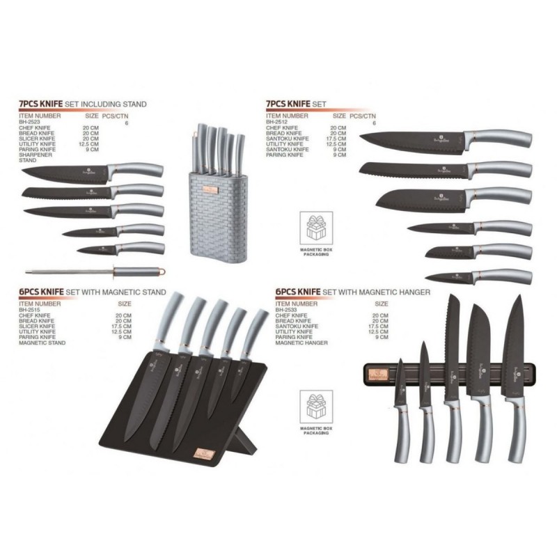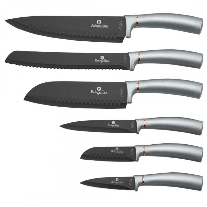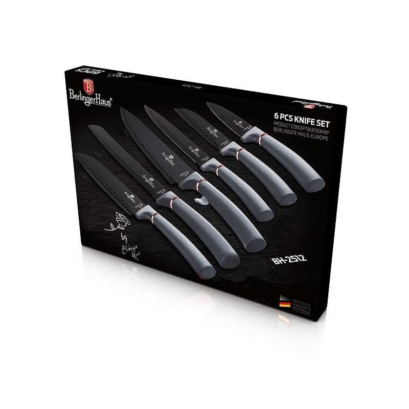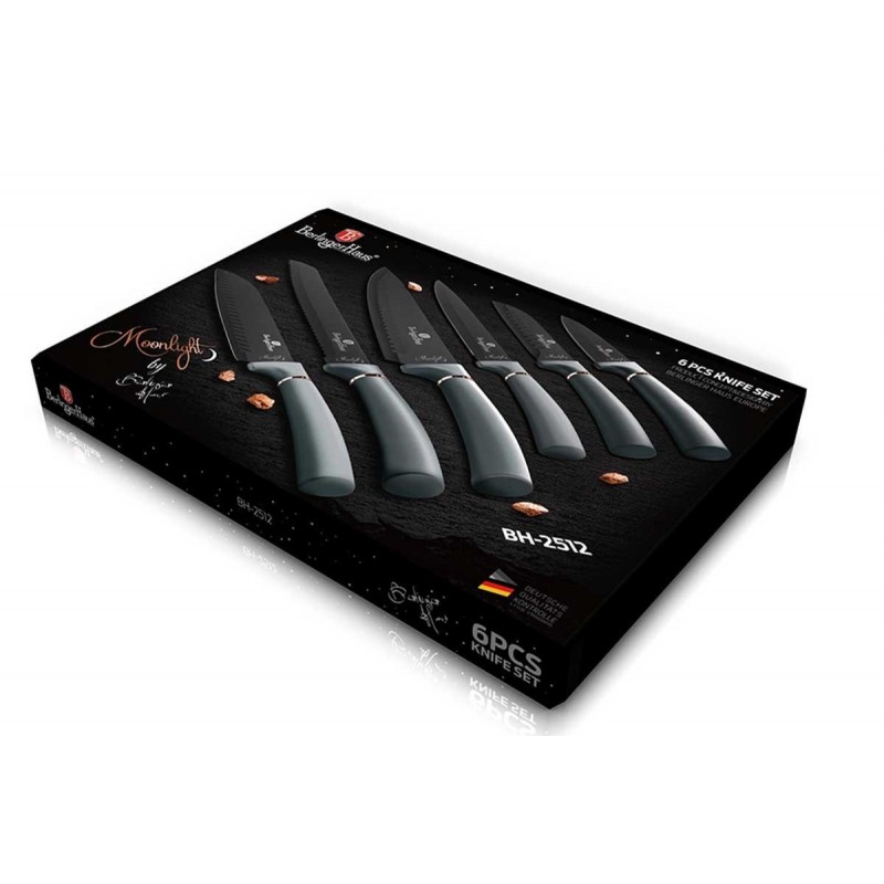 Zestaw noży 6 elementów firmy BERLINGER HAUS z serii MOONLIGHT. Noże ze stali nierdzewnej dodatkowo pokryte powłoką anty-przywierającą wysokiej klasy. Wyposażone w uchwyty pokryte bardzo trwałą cienką warstwą silikonu dla uzyskania pewnego trzymania w każdych warunkach. Całość znajduje się w efektownym pudełku kartonowym z wytłoczką z pianki, zamykana na magnes.