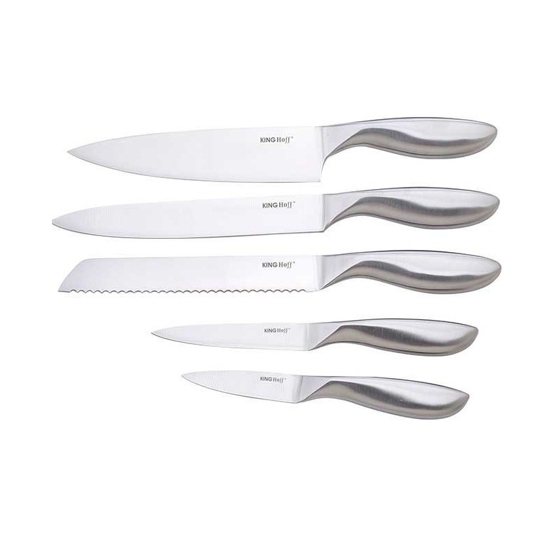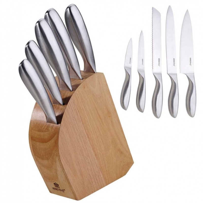 6 elementowy zestaw noży w bloku firmy KINGHOFF. Przeznaczone do porcjowania mięsa i ryb, krojenia pieczywa oraz obierania i siekania warzyw.