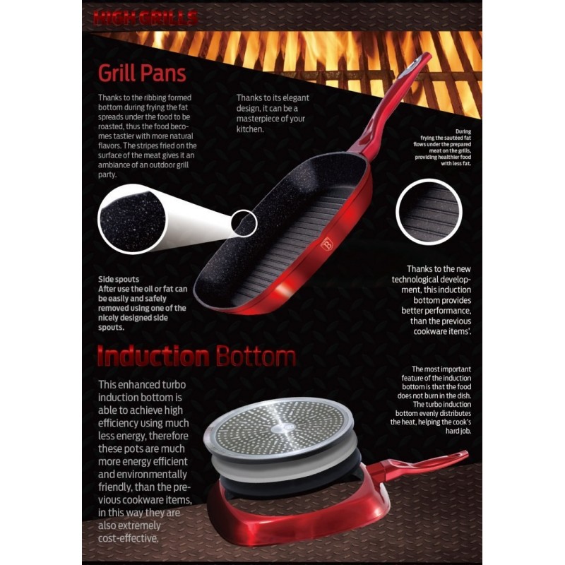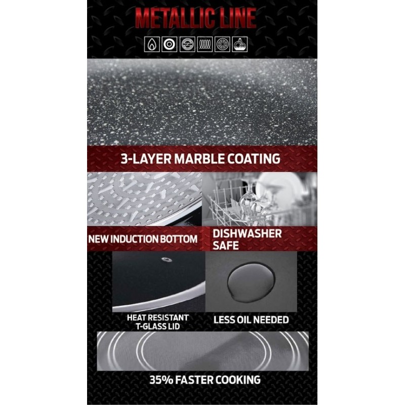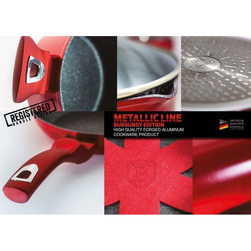 Garnki i akcesoria z serii METALLIC firmy BERLINGER HAUS wykonane są z wysokiej klasy kutego aluminium pokrytego wewnątrz potrójną powłoką granitową (marble) o bardzo wysokim współczynniku twardości. Powłoka zewnętrzna występuje w kilku wersjach kolorystycznych o charakterystycznym metalicznym połysku. Te atrakcyjne i modne naczynia wyposażone są standardowo w uchwyty typu SOFT TOUCH (silikon handle). Przystosowane do wszystkich rodzajów kuchenek: gazowa, elektryczna, ceramiczna, halogenowa, indukcyjna. System TURBO INDUCTION (bardzo szybko nagrzewają się) pozwala zaoszczędzić nawet 35% energii.