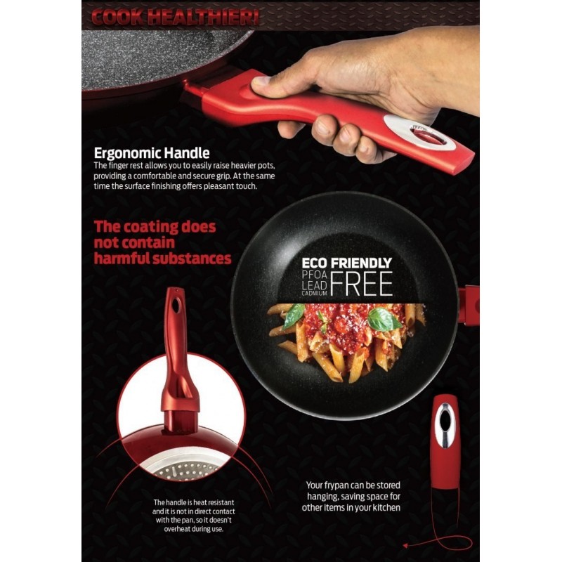 Granitowa powłoka sprawia, że naczynia są wyjątkowo odporne na wszelkie zarysowania i trwałe. Ten typ garnków i patelni pozwala również na smażenie przy użyciu minimalnej ilości tłuszczu, ponieważ naczynie rozgrzewa się podobnie do kamienia i oddaje ciepło całą swą powierzchnią.