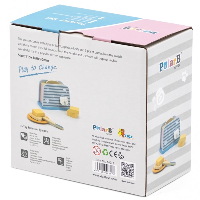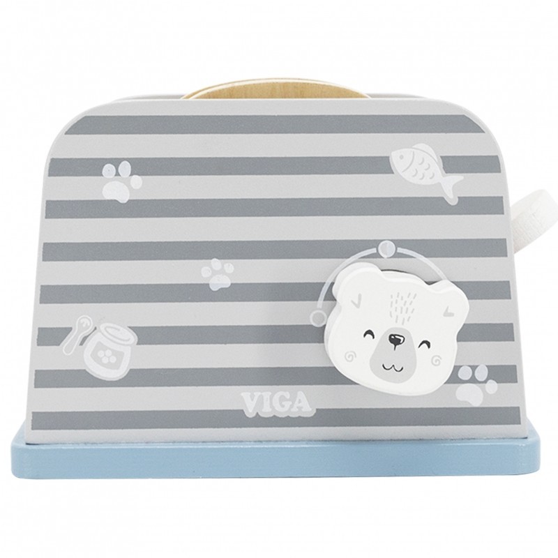 Zestaw składa się z tostera, 2 kromek chleba, talerza, noża i 3 kawałków masła. Wszystkie elementy w stonowanych kolorach.