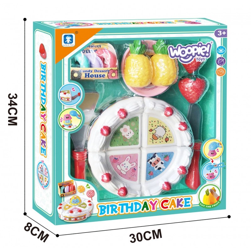 Zestaw do herbaty z tortem od marki Woopie to idealna propozycja na spotkania z przyjaciółmi. Zestaw urodzinowy będzie idealnym atrybutem każdej małej gospodyni do zorganizowania niezapomnianego przyjęcia. Dziecko może wcielić się i poczuć się jak dorosły gospodarz domu. W zestawie znajdziemy pięknie udekorowany tort, który możemy pokroić na 4 kawałków i poczęstować swoich gości. W skład zestawu wchodzą także inne przekąski, np. ciasteczka i owoce, a do tego również nóż do krojenia tortu i owoców, talerzyk na tort i szpatułka do podnoszenia ciasta. Krojenie tortu i owoców jest doskonałą zabawą, która rozwija zdolności manualne dzieci. Zabawy w odgrywanie ról pozytywnie rozwijają dziecko - rozwijają wyobraźnie i kreatywność oraz świadomość codziennego życia.