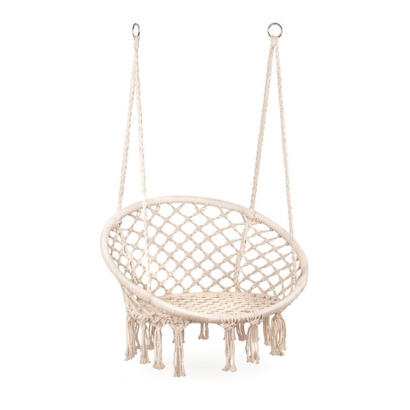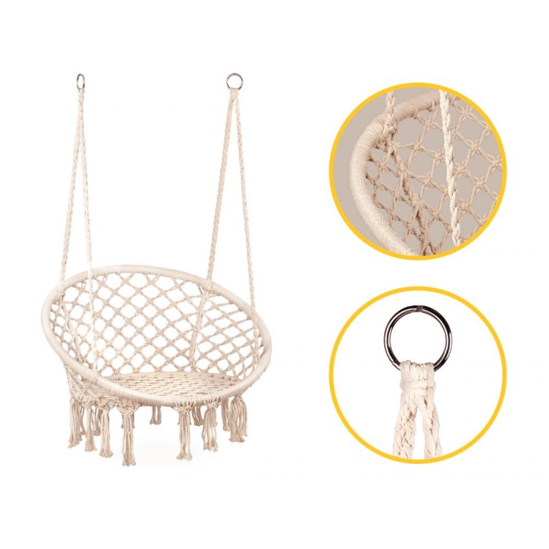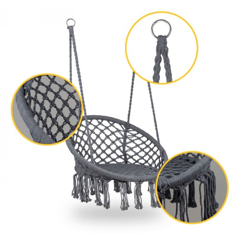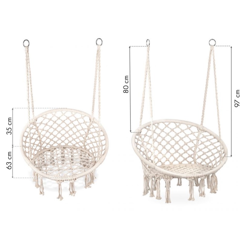 Wiszące krzesło wykonane zostało z wytrzymałych materiałów. Wymiar hamaku: 63x35x97cm pozwala na wypoczynek zarówno osoby dorosłej jak i dziecka.