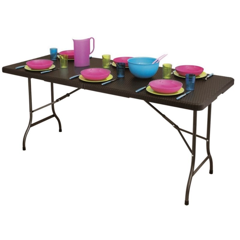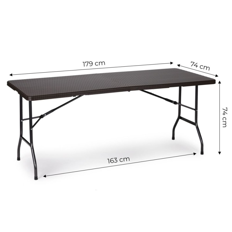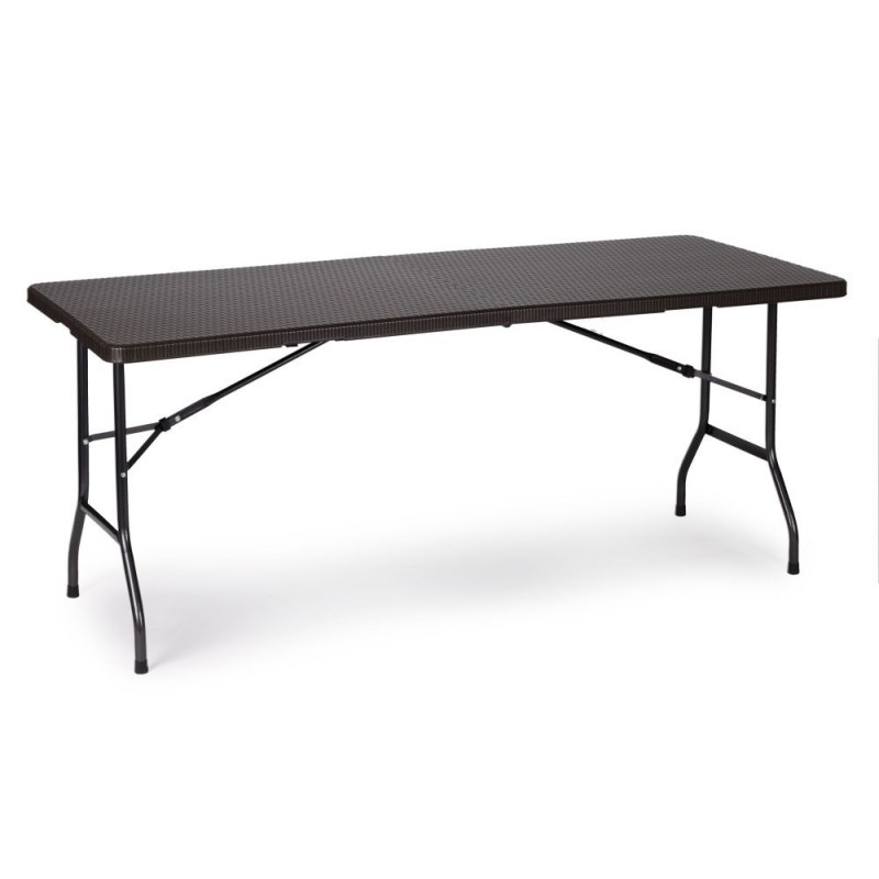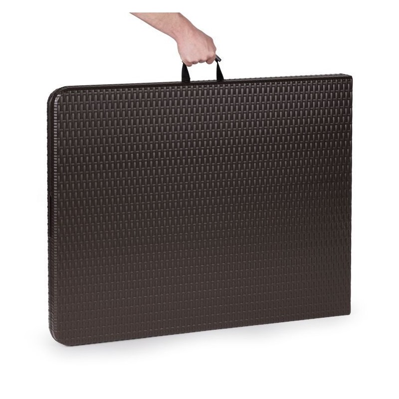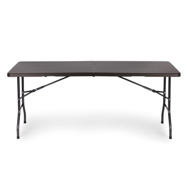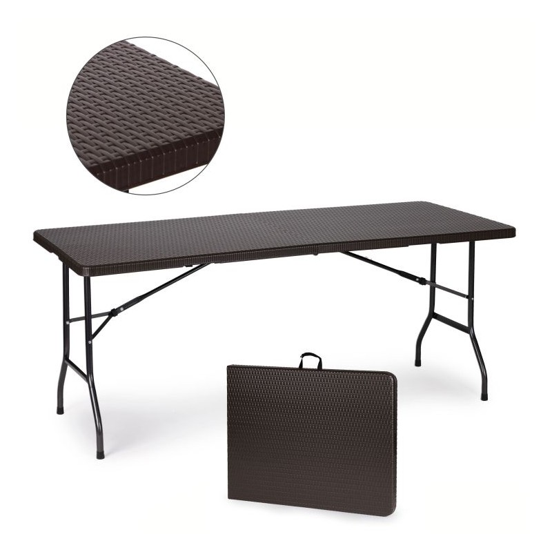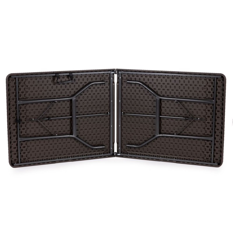 Blat stołu został wykonany z wytrzymałego materiału HDPE, o wzorze imitującym rattan. Stół jest w pełni odporny na warunki atmosferyczne panujące na zewnątrz. Całość podtrzymuje wytrzymały, stalowy stelaż malowany proszkowo. Stół bankietowy posiada blokadę przed samoistnym i niekontrolowanym złożeniem. Stół można złożyć w pół do poręcznej walizki z rączką. Maksymalne obciążenie to 100 kg. Średnica nóg stołu wynosi 25 mm.